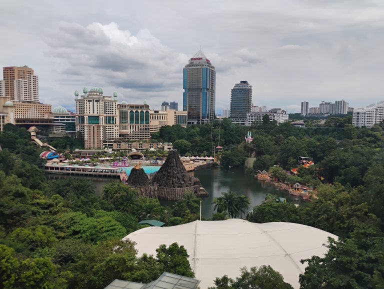 Alternative Text: The image shows a cityscape with tall modern buildings overlooking a large water-themed amusement park surrounded by lush greenery. There are pools, slides and decorative rock structures, with a calm lake in the center and dense trees in the foreground in Bandar Sunway, Malaysia.
