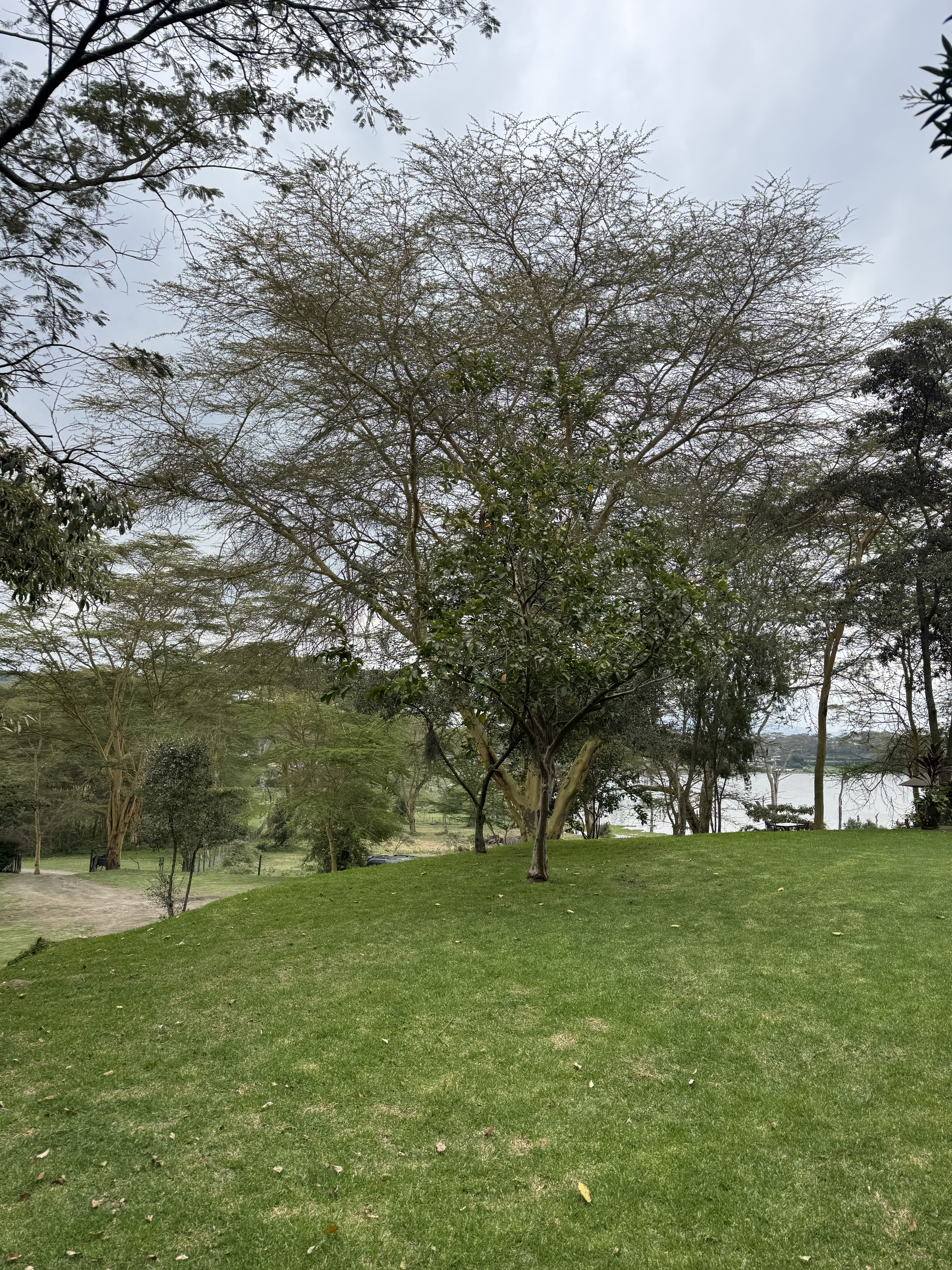 Alternative Text: A lush green hillside featuring several trees, including a large tree with sparse branches and smaller foliage surrounding it.