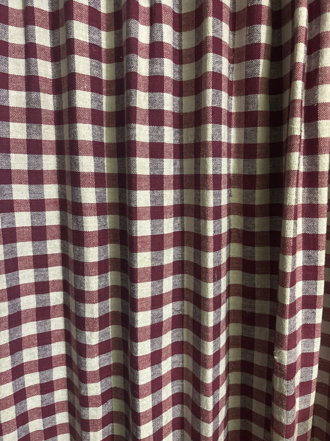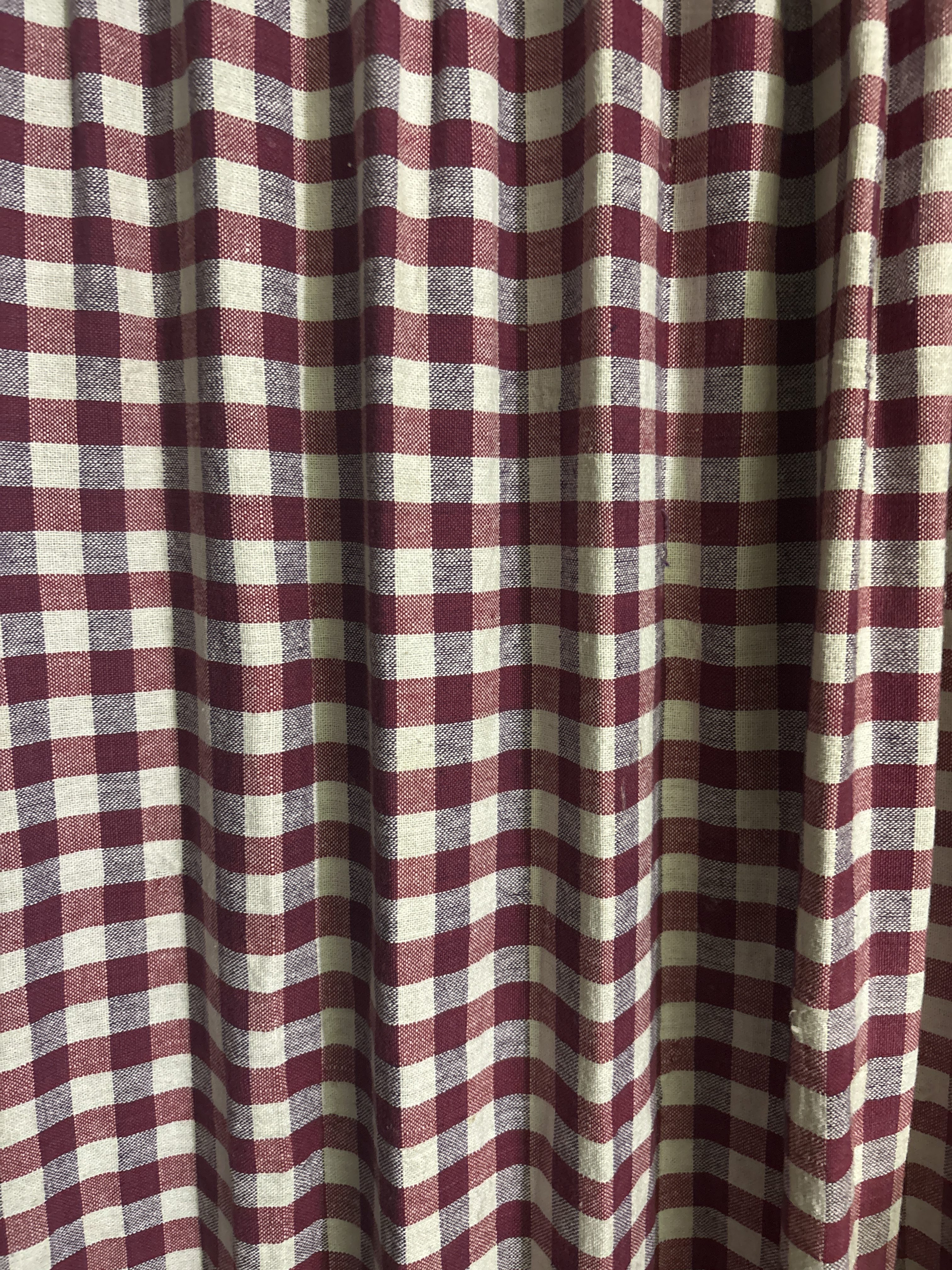 Alternative Text: A close-up view of a fabric with a classic checkered pattern, featuring alternating squares of deep burgundy and cream colors