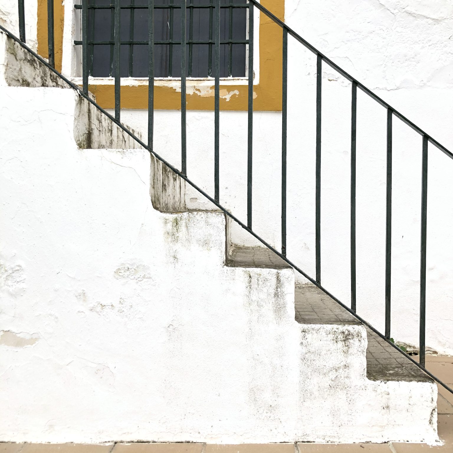 Alternative Text: Slightly deteriorated external staircase with dark green painted railing.