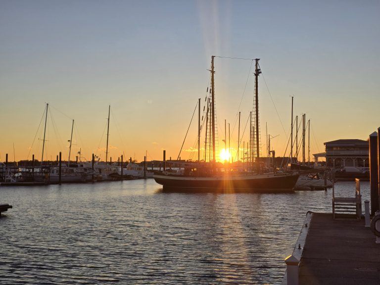 Alternative Text: A scenic harbor at sunset with sailboats silhouetted against a vibrant orange and yellow sky in Newport, Rhode Island.