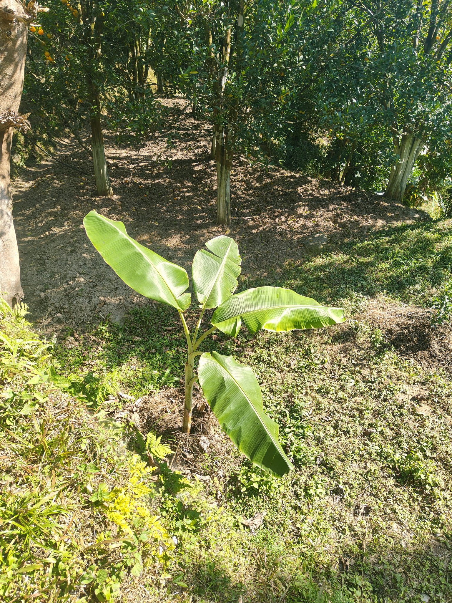 Alternative Text: A young banana plant with broad green leaves is growing in a garden area surrounded by grassy ground and other greenery.
