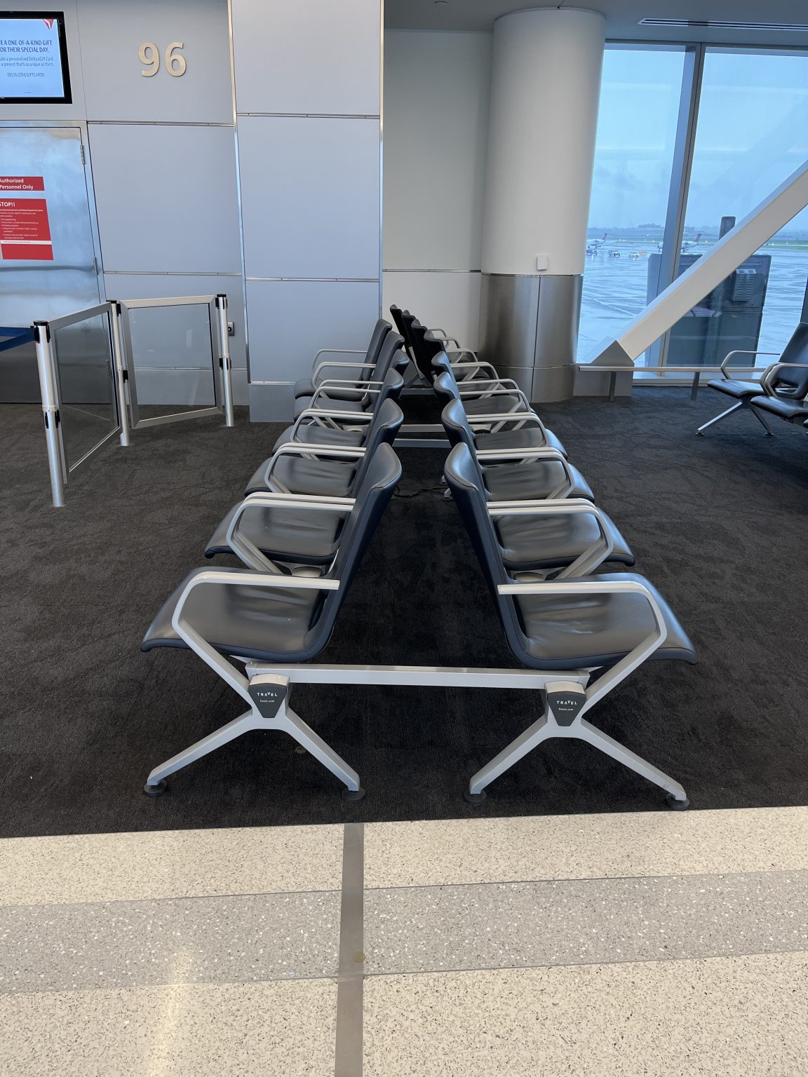 Alternative Text: Row of empty airport chairs.