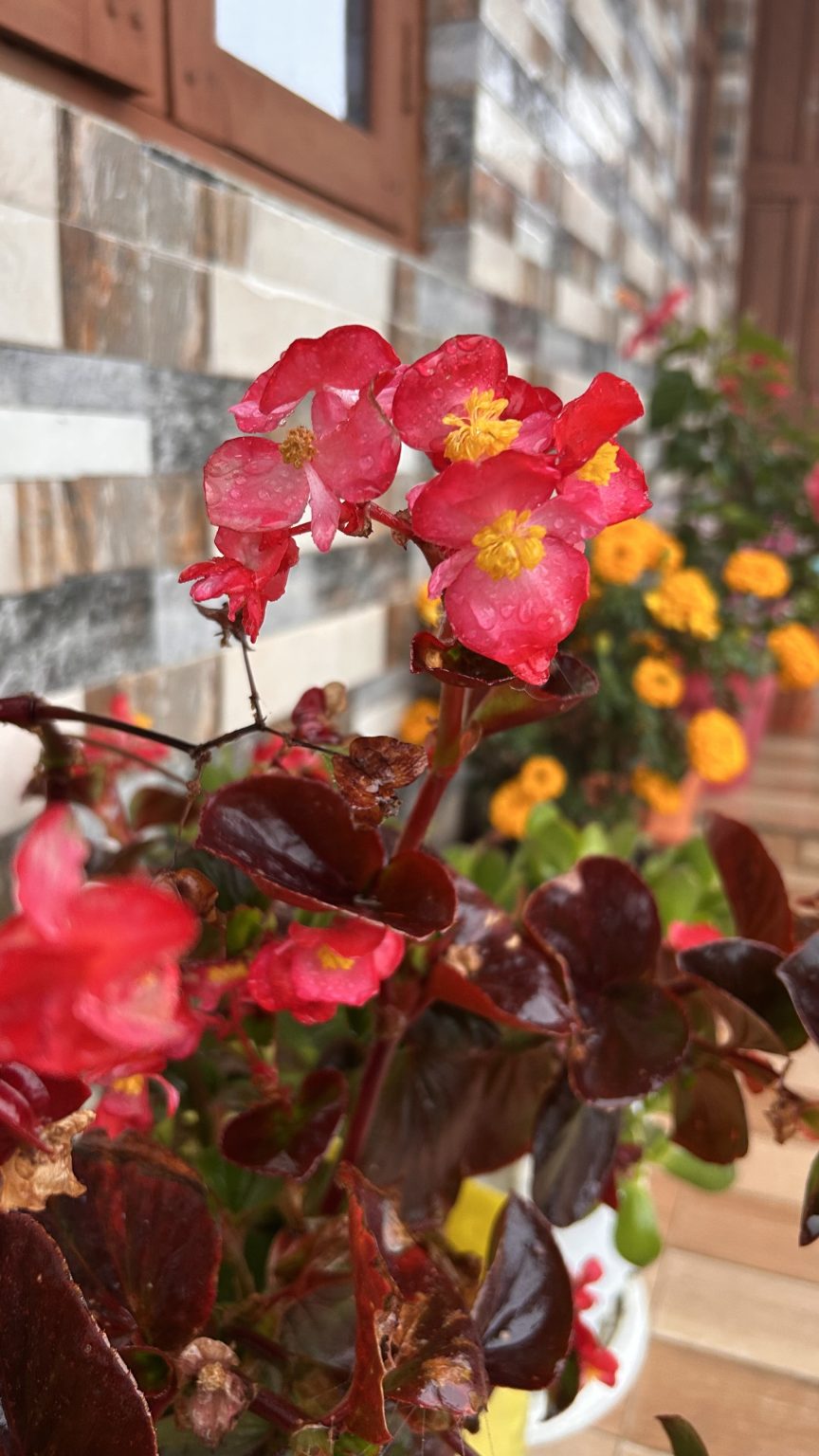 Alternative Text: A close-up photograph of vibrant red and yellow flowers with water droplets on the petals, surrounded by lush green leaves