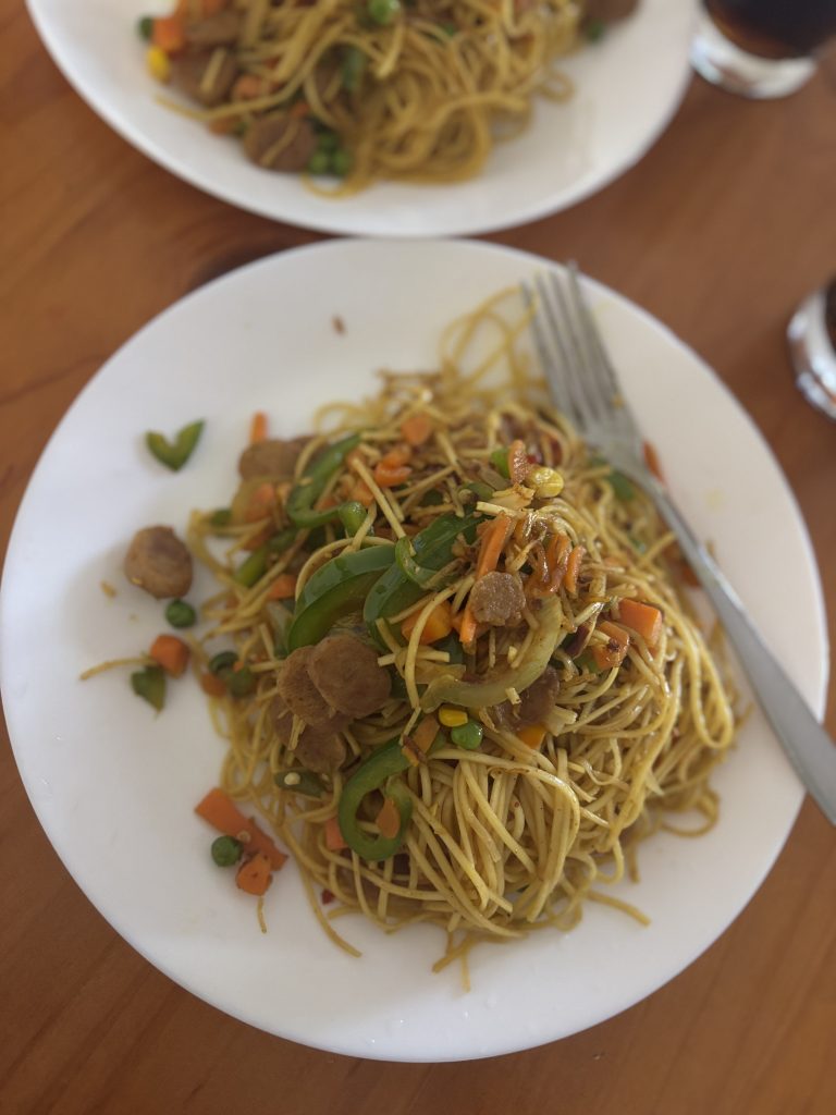 Alternative Text: chowmein with garnish and sausage on a white plate