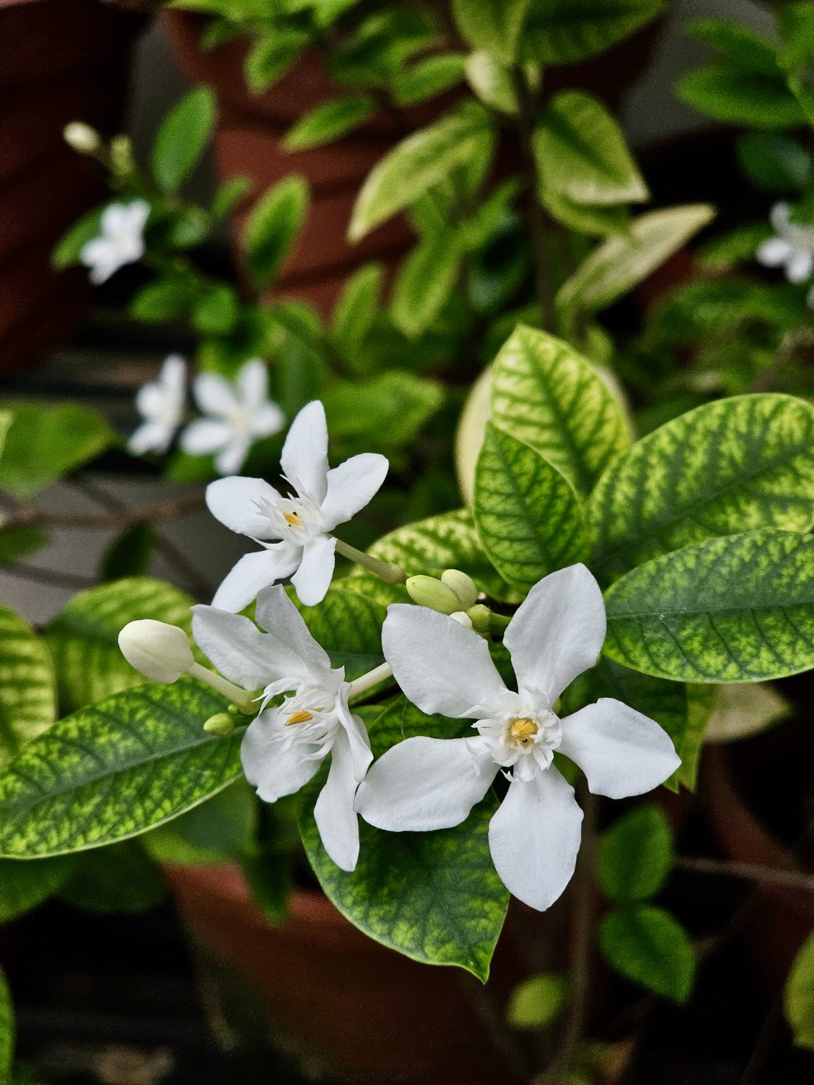 Alternative Text: A close-up of small white flowers (commonly known as Snowflake plant or Crepe Jasmine) blooming among bright green leaves. The soft background highlights the fresh beauty of the plant. Captured from Perumanna, Kozhikode.