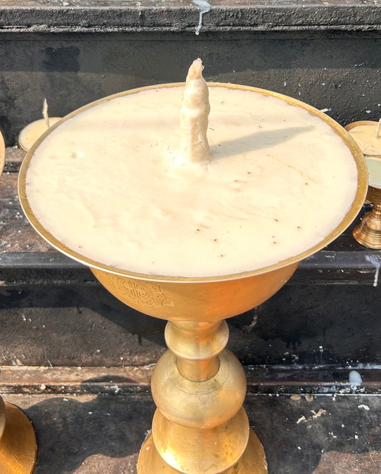Alternative Text: A golden pedestal holds a shallow, circular bowl filled with a creamy, pale substance