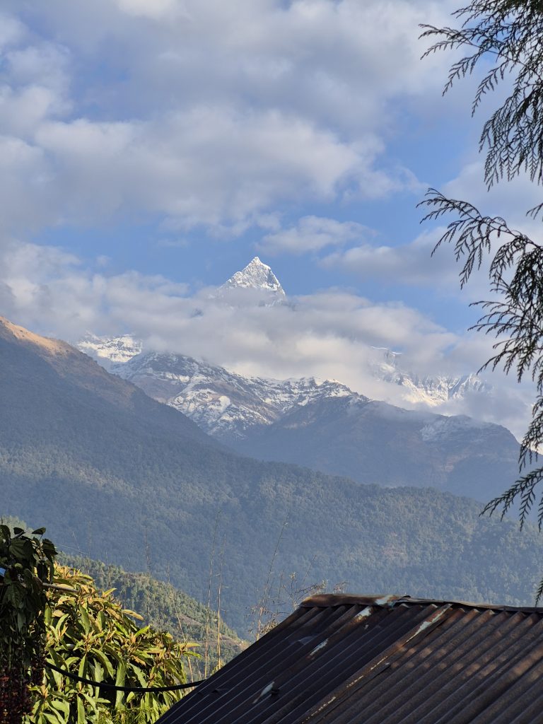 Alternative Text: A scenic view of Machhapuchhre (Fishtail), with snow-capped peaks rising above a lush green landscape and drifting clouds.