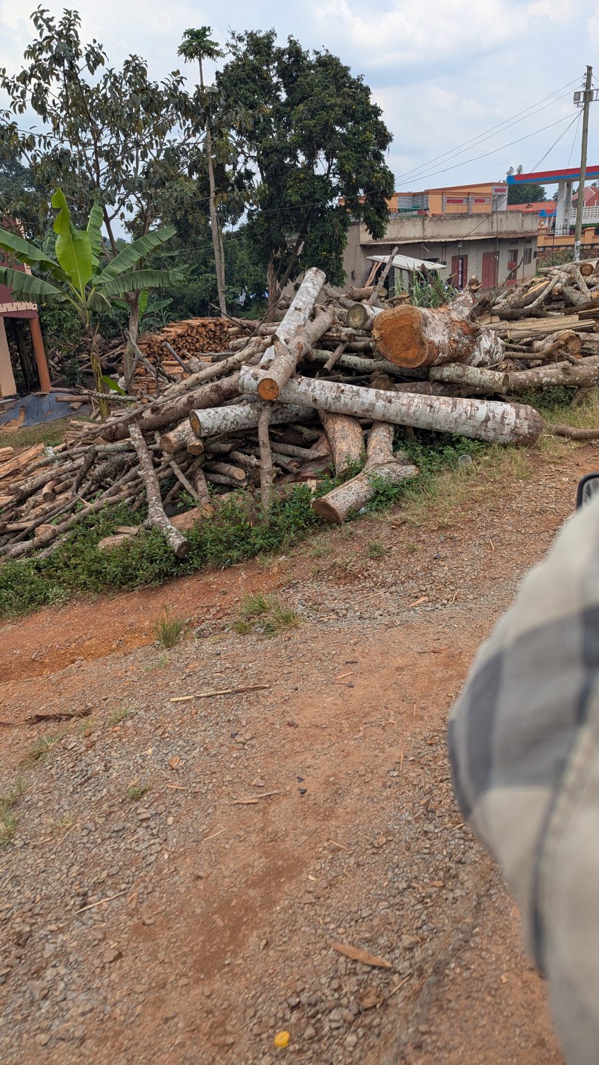 Alternative Text: A pile of cut logs piled to make firewood in an open clearing. Buildings line the background.