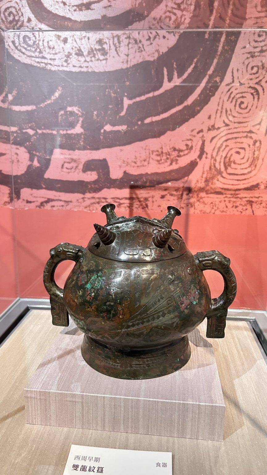 Alternative Text: A bronze vessel with a rounded body, featuring two ornate handles and decorative designs etched into its surface. The vessel has a lid with two spouts, each topped with pointed ornaments