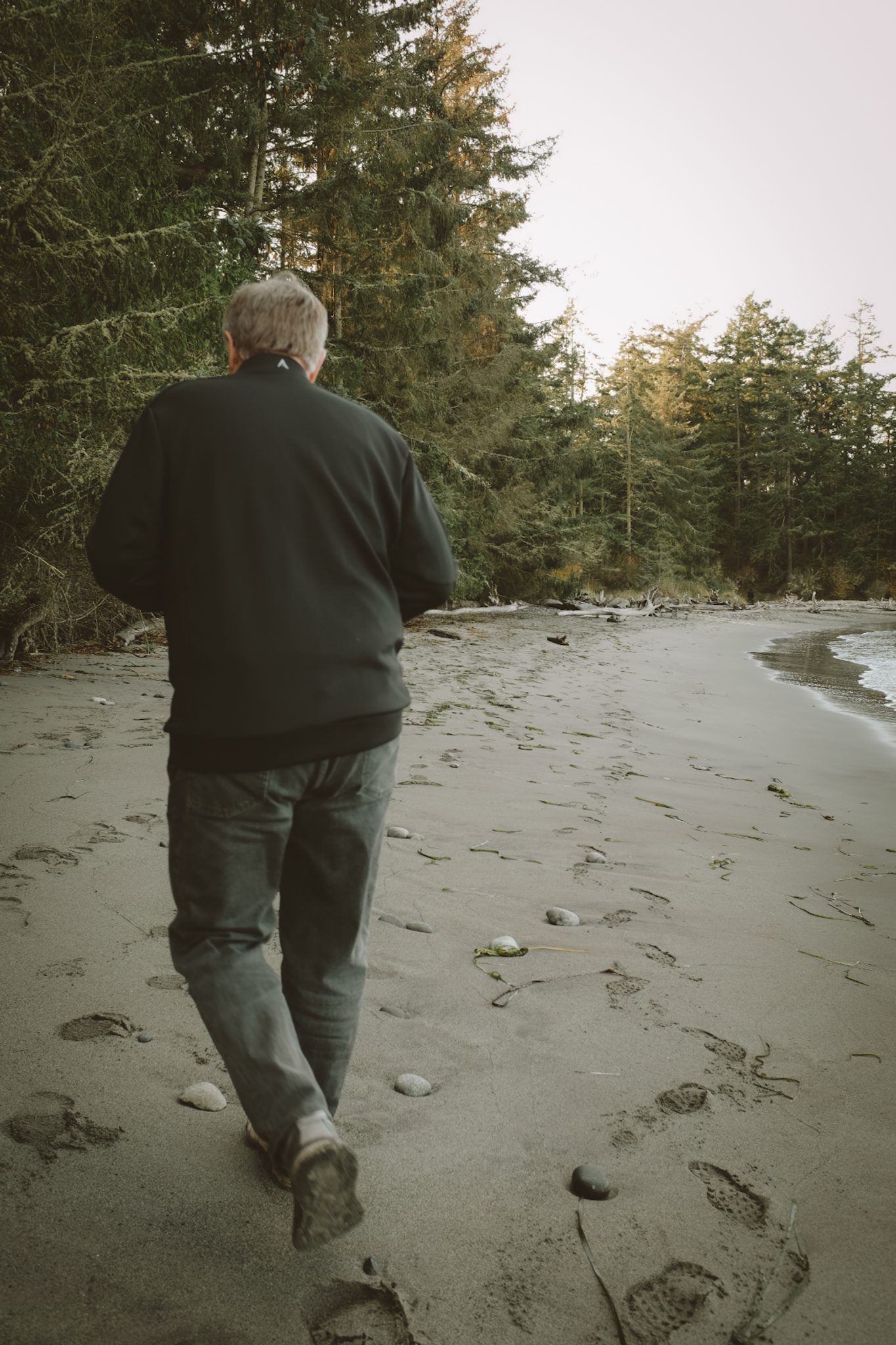 Alternative Text: Man walking down a sandy beach with footsteps visible all around and forest trees lining the path.