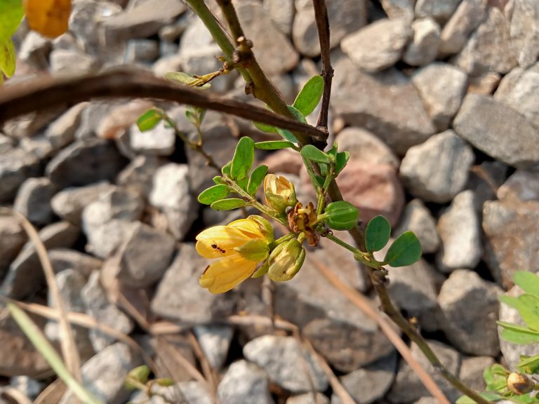 Alternative Text: A close-up of a small plant with yellow flowers and green leaves among gray and brown stones, with an ant on one flower. Kawtoli, Brahmanbaria, Bangladesh.