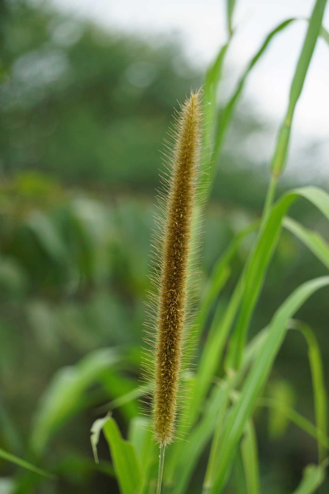 Alternative Text: A vertical close-up of a single brown foxtail millet seed head standing upright amid green foliage, with a blurred background.