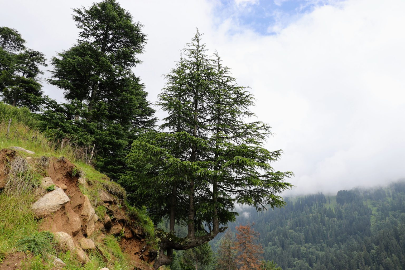Alternative Text: Unique photo of a tree growing on a side of cliff with three vertical branches. Photo captured during Hampta Pass trek. Location: Jobri, Himachal Pradesh, India.