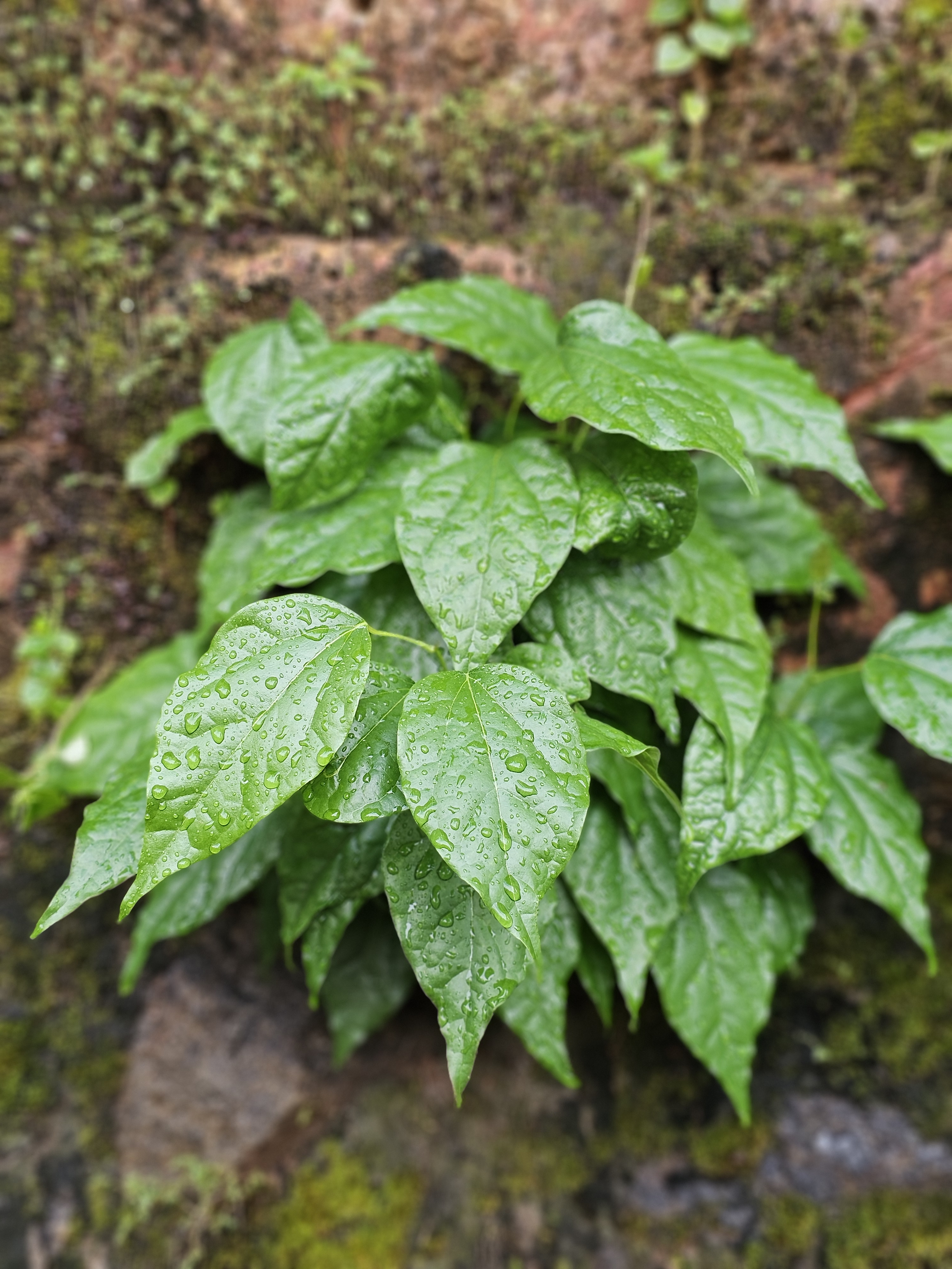 Alternative Text: Bright green leaves with rain droplets grow beside a mossy wall in Kerala, captured close-up with a soft blurred background.