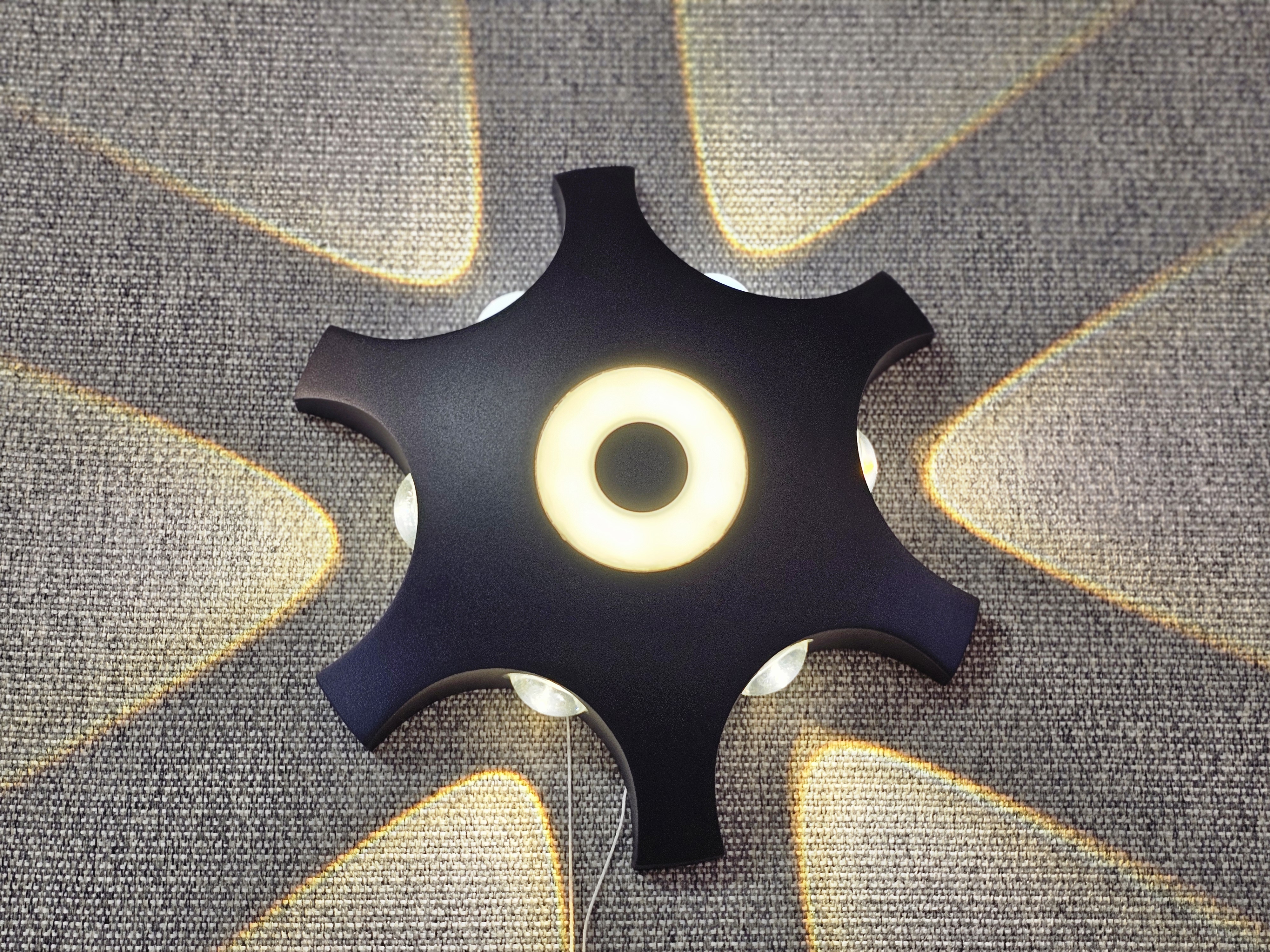 Alternative Text: A black, star-shaped wall lamp mounted on a textured gray surface. The lamp features a central circular light and four additional lights emanating from its points, creating a pattern of light and shadow on the wall. Captured from an electrical shop in Kozhikode.