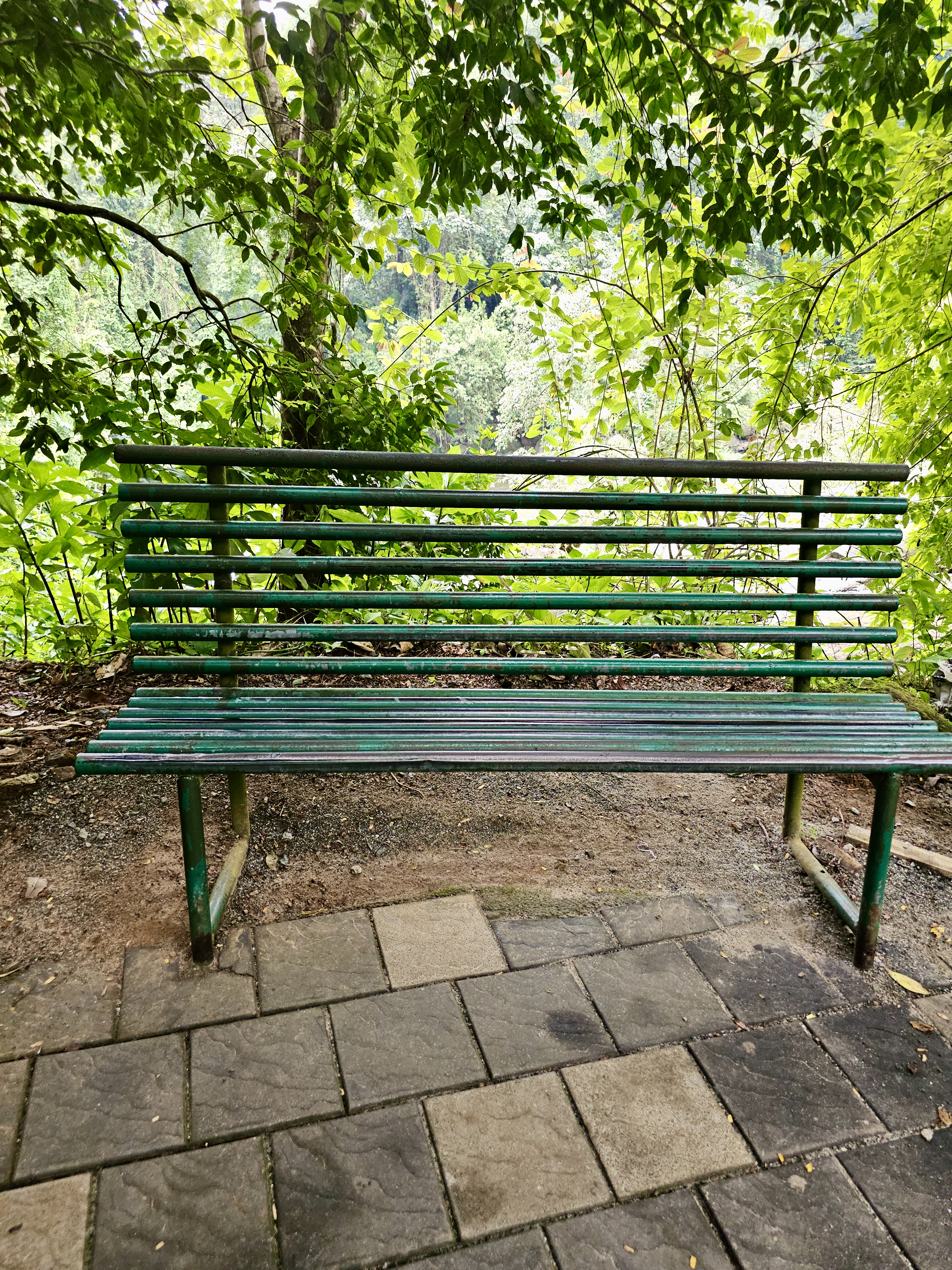 Alternative Text: Green metal tubular bench stands on dirty and tiled ground, surrounded by lush green tree vegetation
