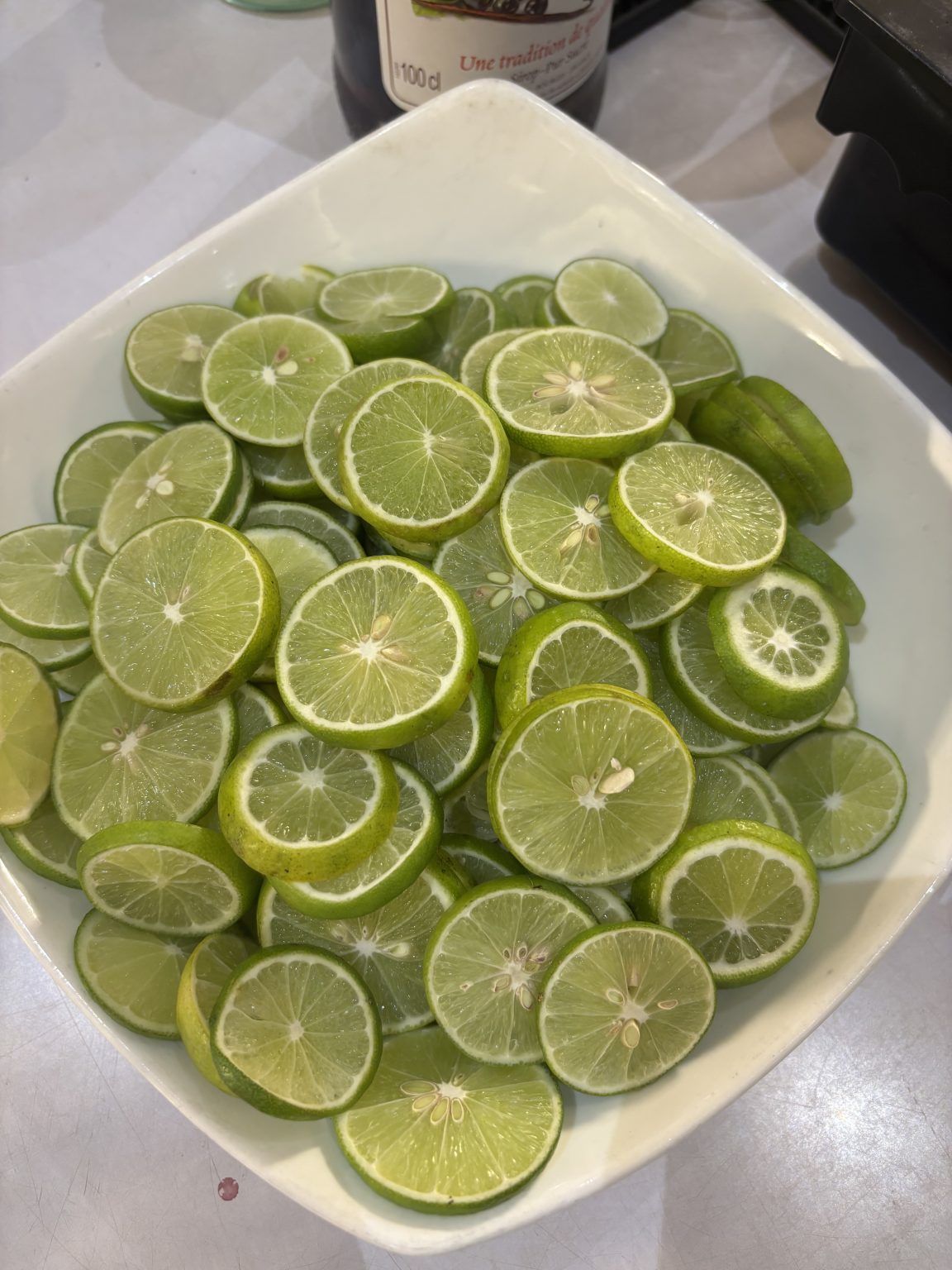 Alternative Text: A white square bowl filled with numerous sliced limes, showing their bright green flesh and some seeds.