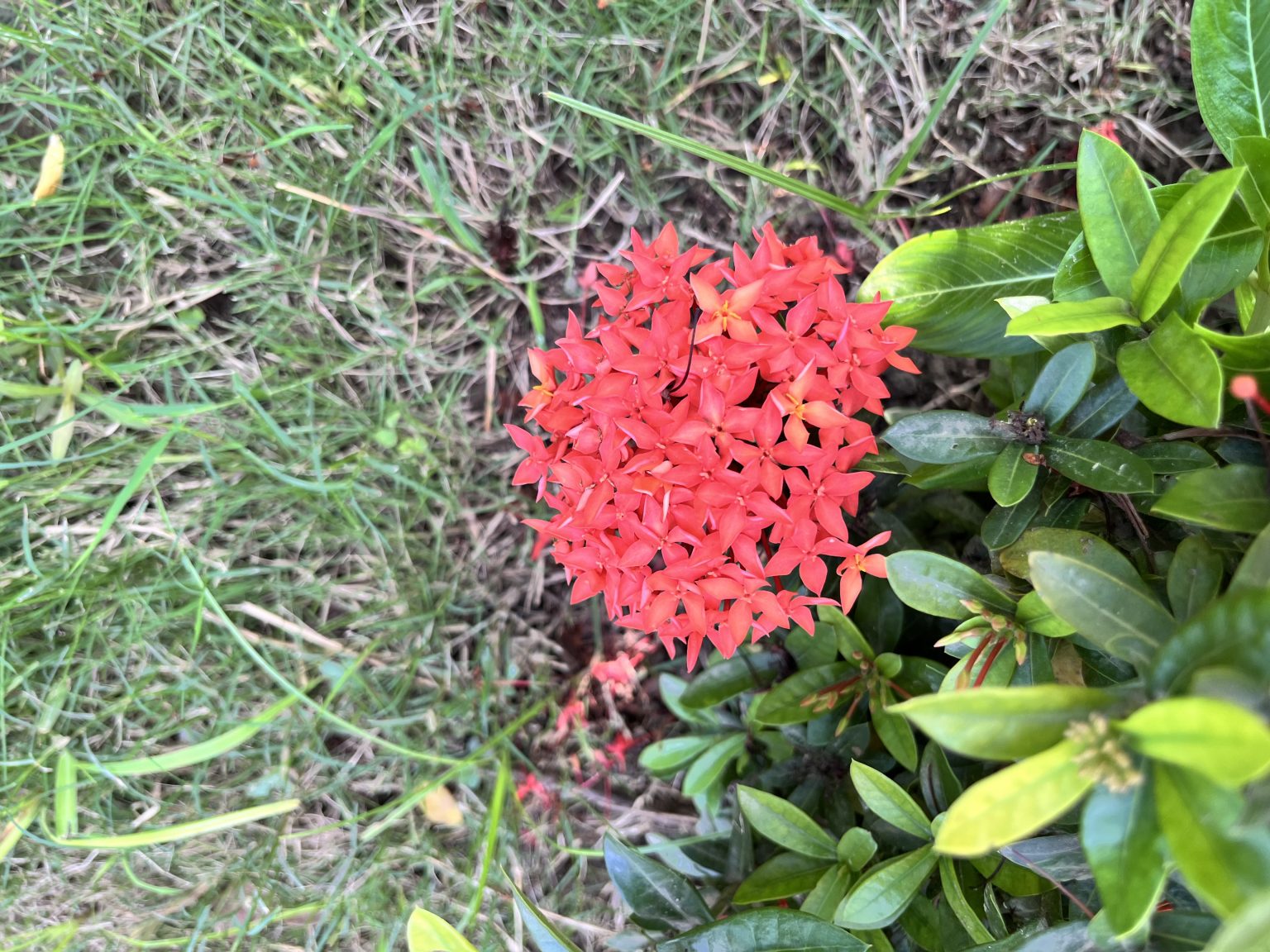 Alternative Text: A cluster of bright red ixora flowers surrounded by green leaves, set against a backdrop of grassy ground.