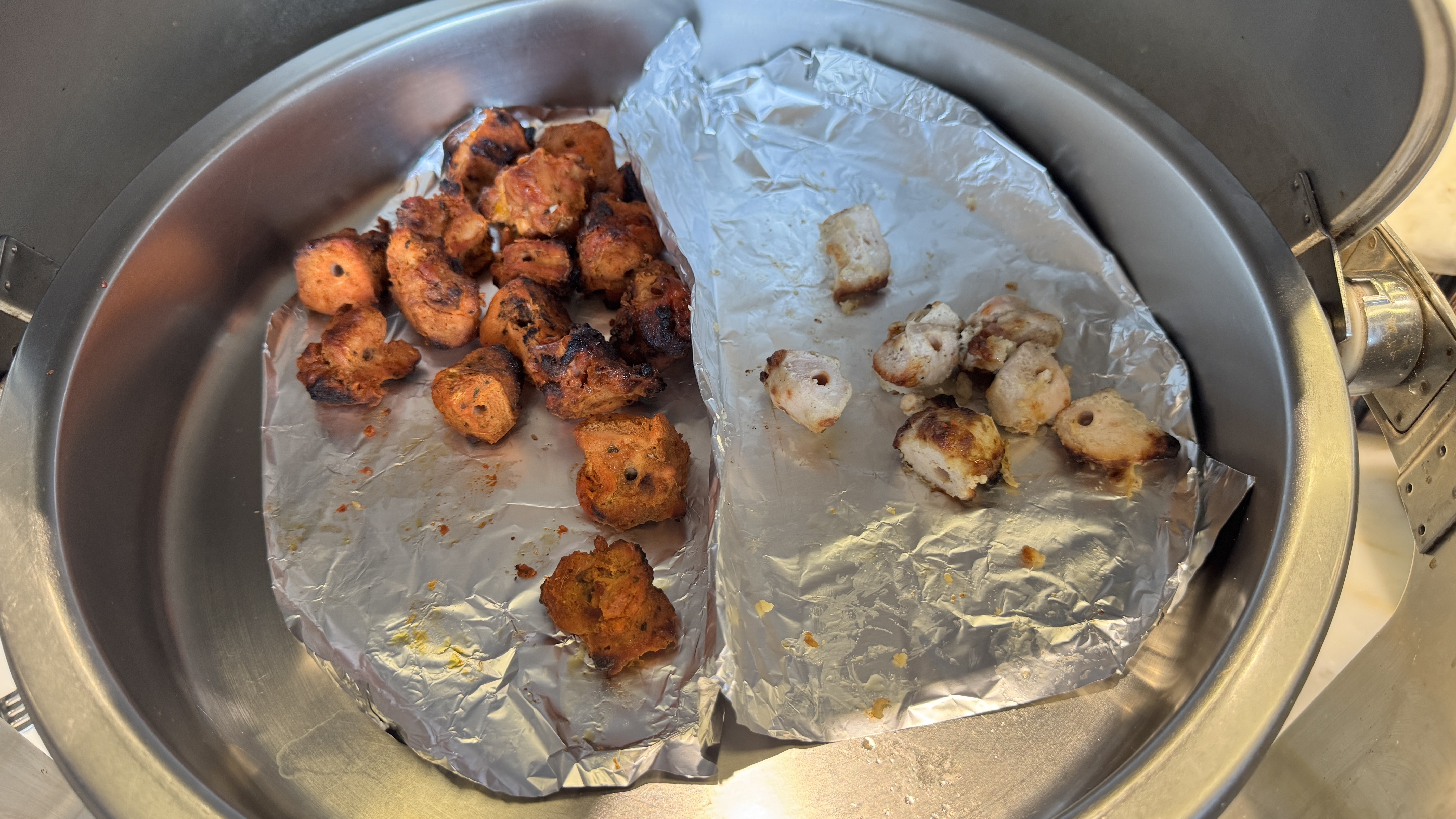 Alternative Text: A round foil-lined buffet dish holds reddish-orange chicken tikka on the left and a few creamy white chicken kebabs on the right.