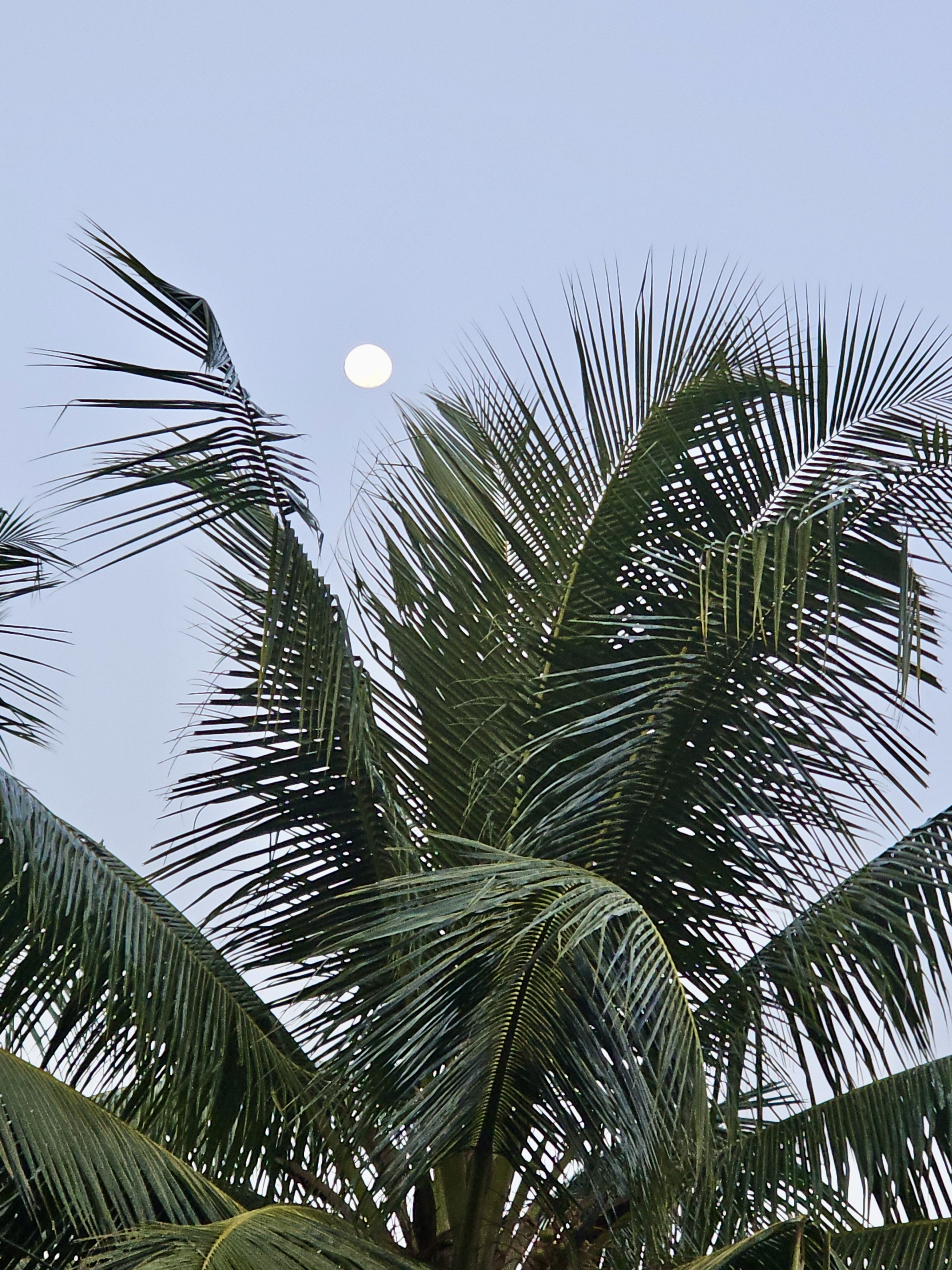Alternative Text: A bright full moon shines in the early evening sky above tall coconut leaves in Velliparamba, Kozhikode. The soft blue sky and calm light create a peaceful and natural scene.