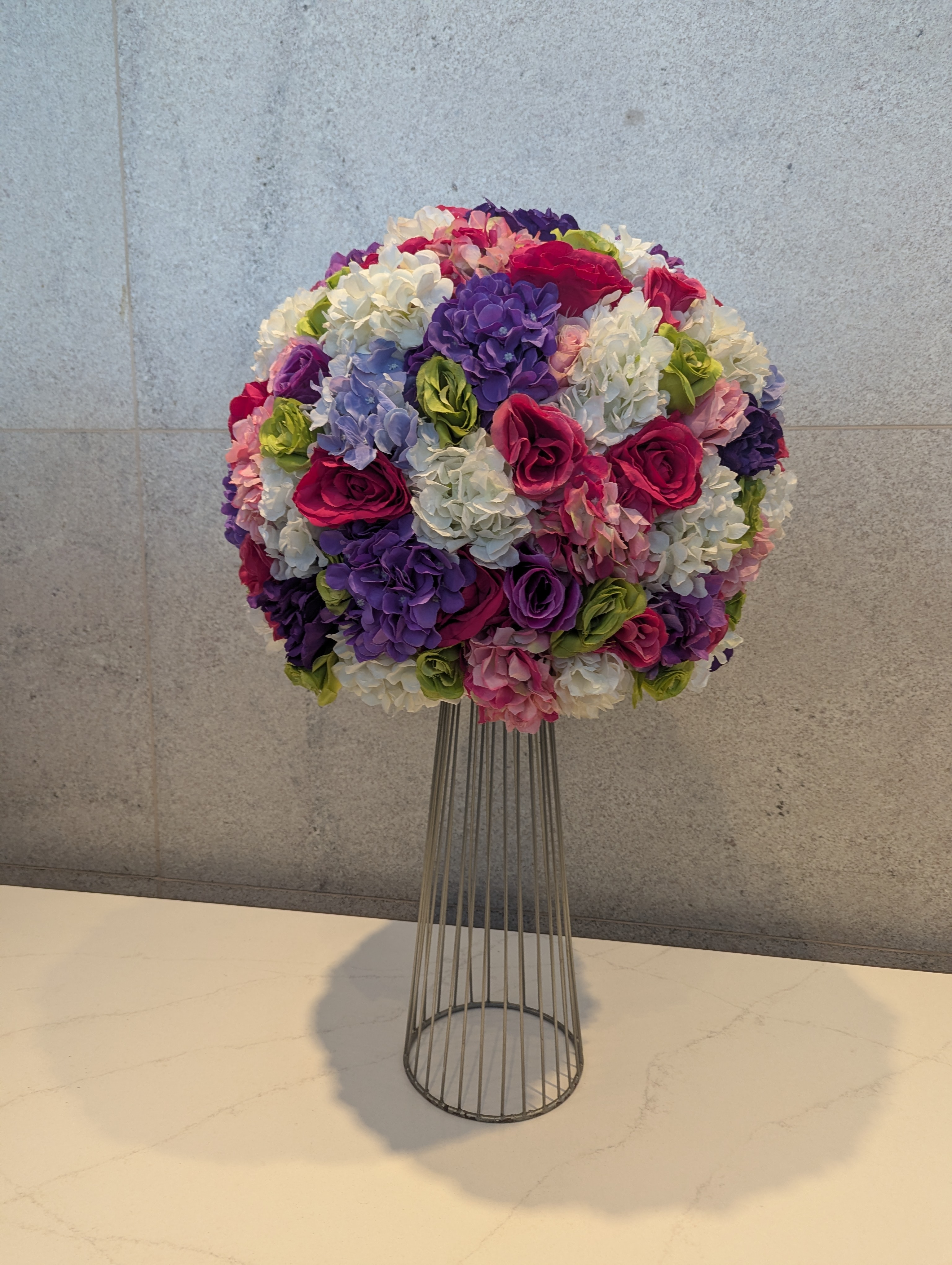 Alternative Text: A round floral arrangement of pink roses, purple hydrangeas, and white flowers sits on a wire-frame pedestal against a gray wall, casting a soft shadow on a light countertop