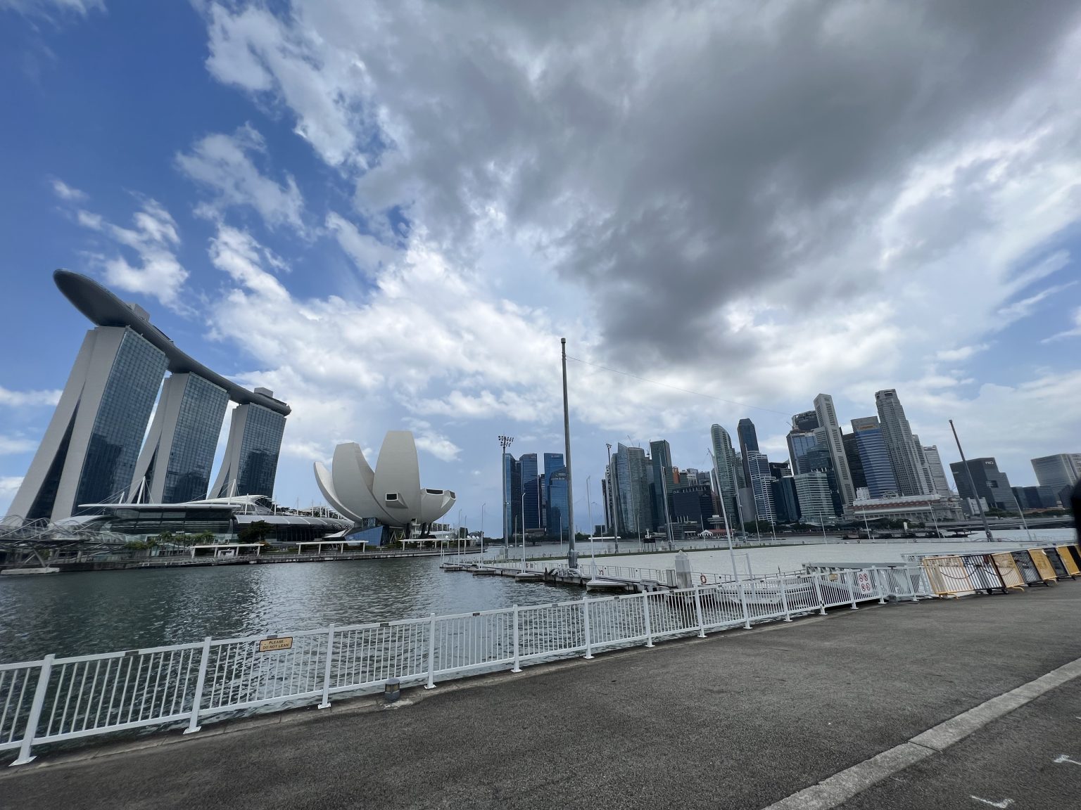 Alternative Text: A scenic view of the Singapore skyline featuring the Marina Bay Sands hotel on the left, the ArtScience Museum, and various other skyscrapers. The foreground shows the water and a walking path under a cloudy blue sky.