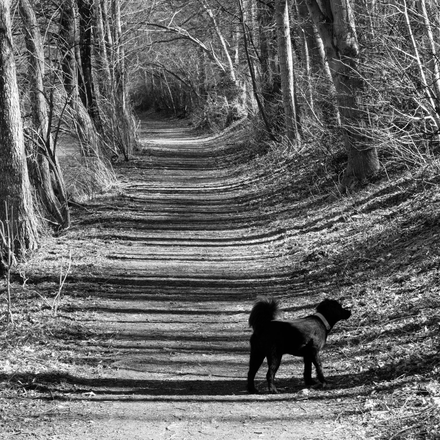 Alternative Text: Rio the dog in the alley shadows. Bar[k] Code.