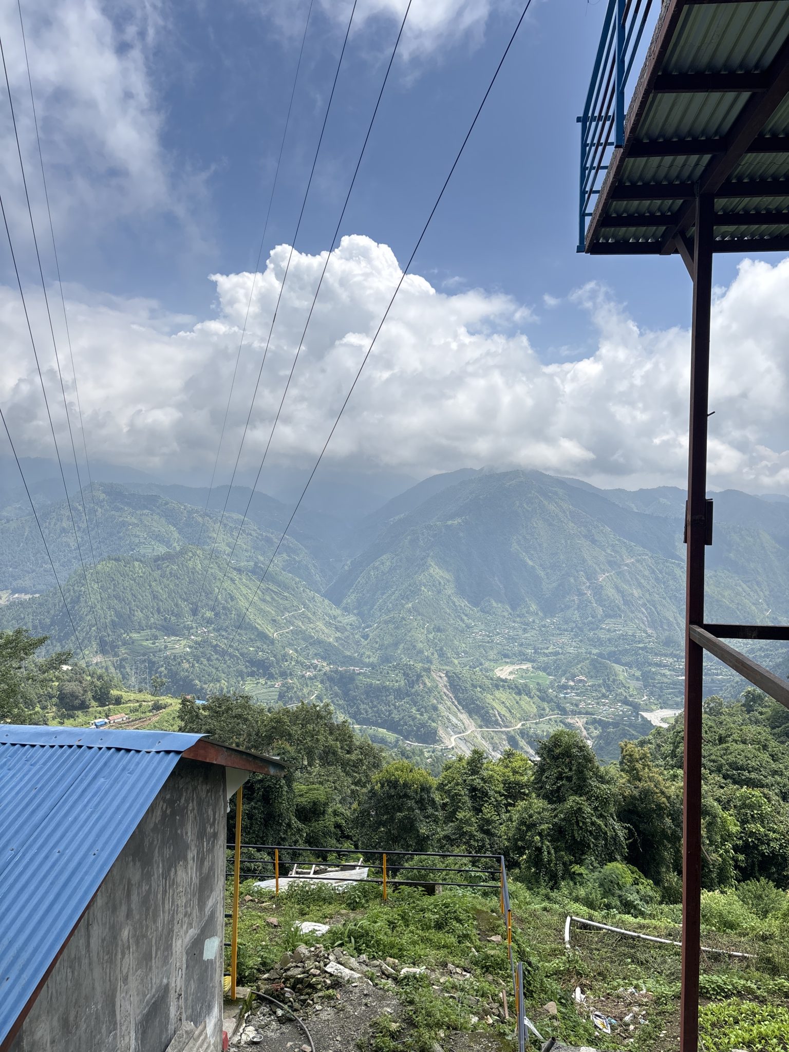 Alternative Text: A scenic view from a hillside showing lush green mountains and valleys under a partly cloudy sky.