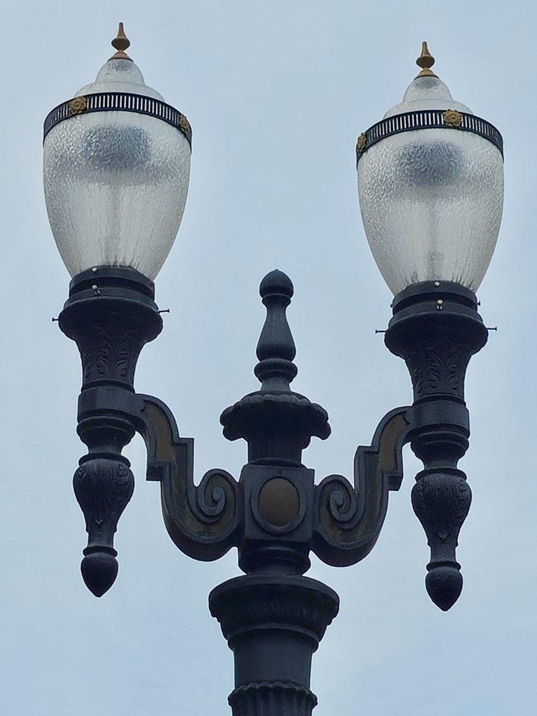Alternative Text: A close-up of a decorative black street lamp featuring two ornate lanterns with textured glass, set against a clear sky. From the streets of Portland