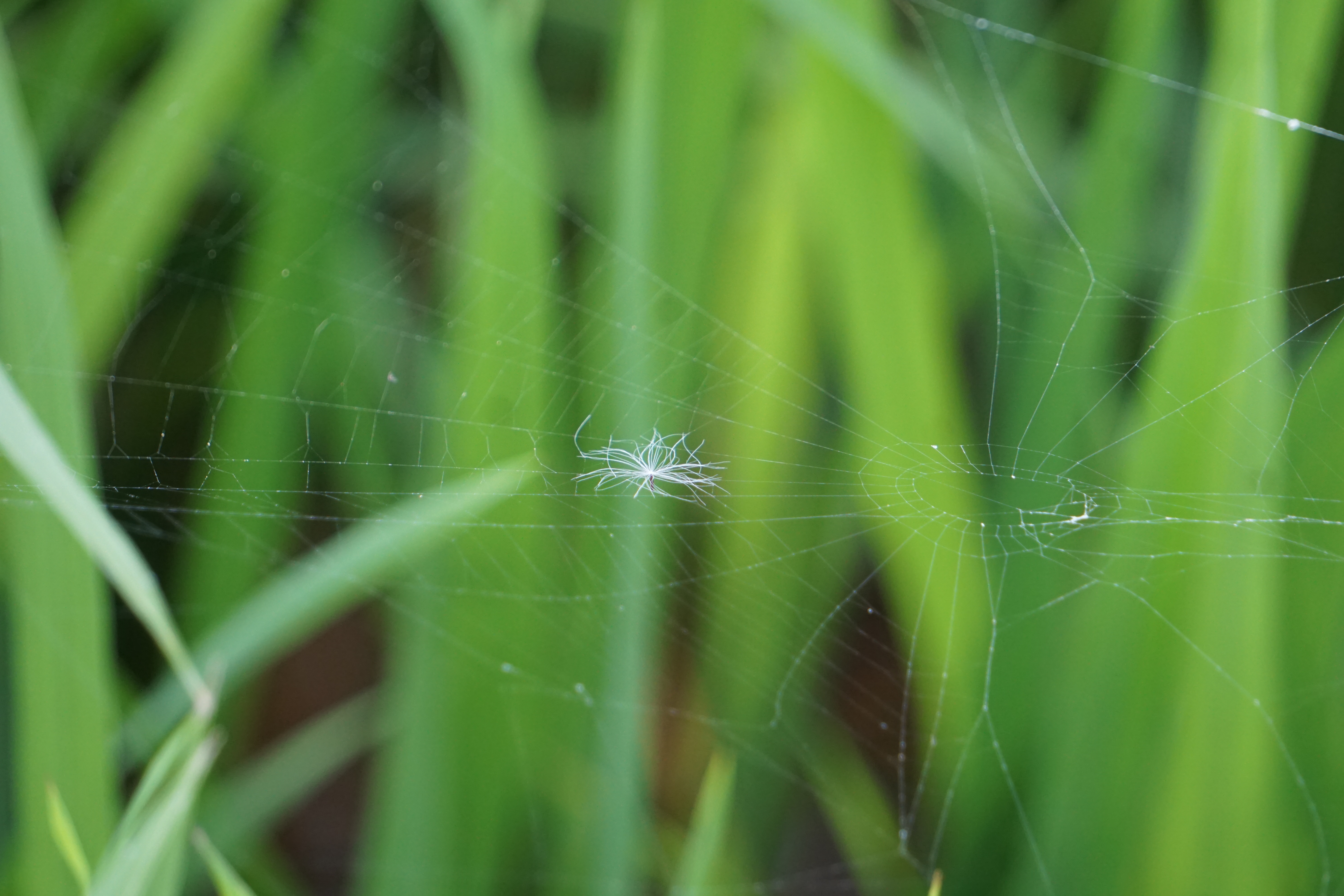 Alternative Text: Close-up of a spider web with a small white feather caught in its strands, set against a green blurred background of grass.