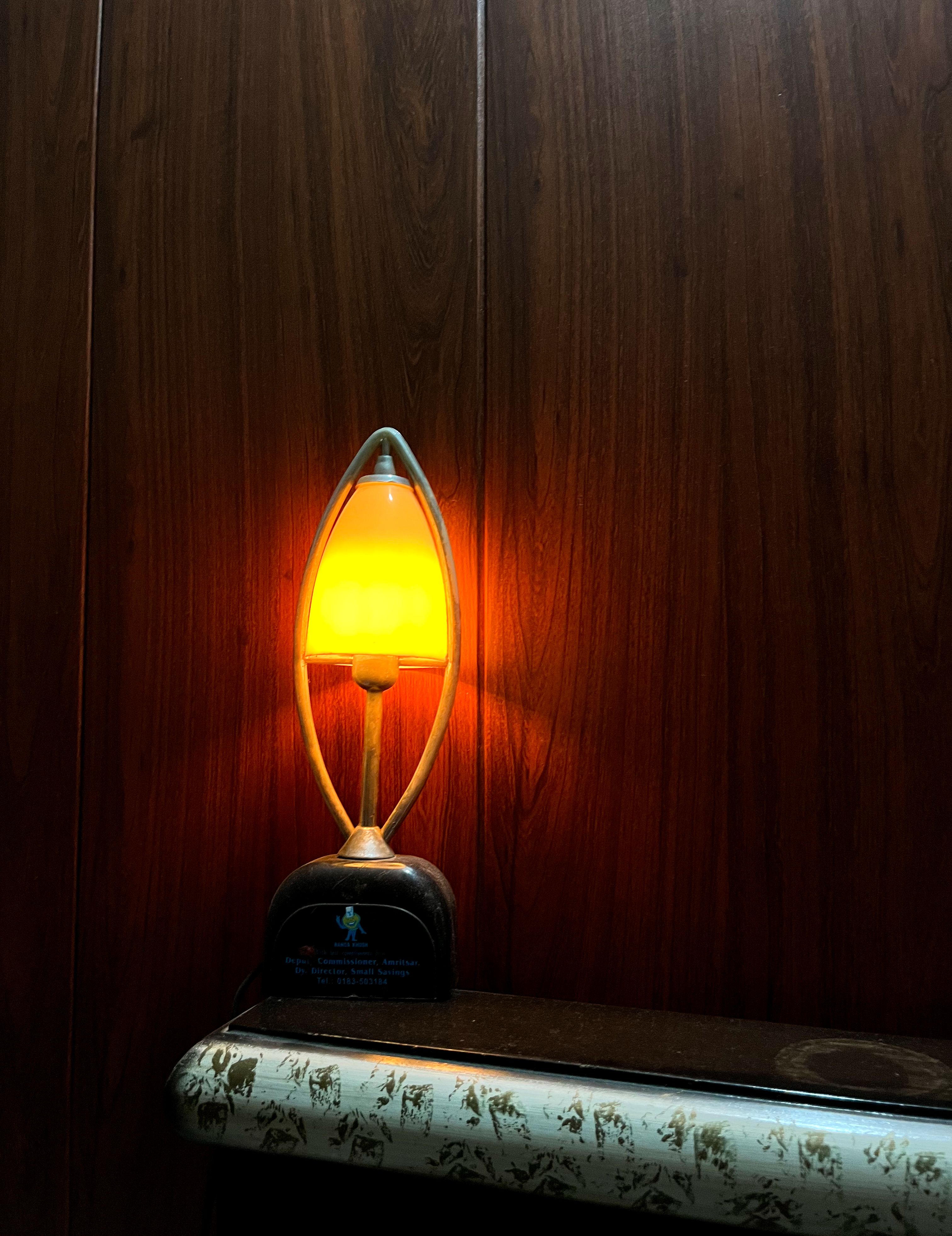 Alternative Text: A cozy bedside lamp emits a warm orange glow, sitting on a dark surface.