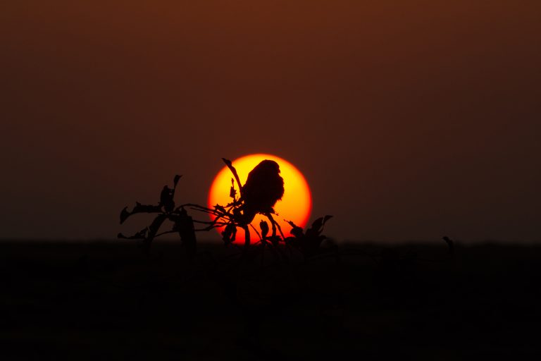 Alternative Text: A silhouette of a Common kestrel bird perched on a branch against a vibrant sunset. The sun appears large and circular, casting a warm orange glow in the background, while the sky transitions from orange to deeper hues of dusk. The scene captures the tranquility of nature at twilight.