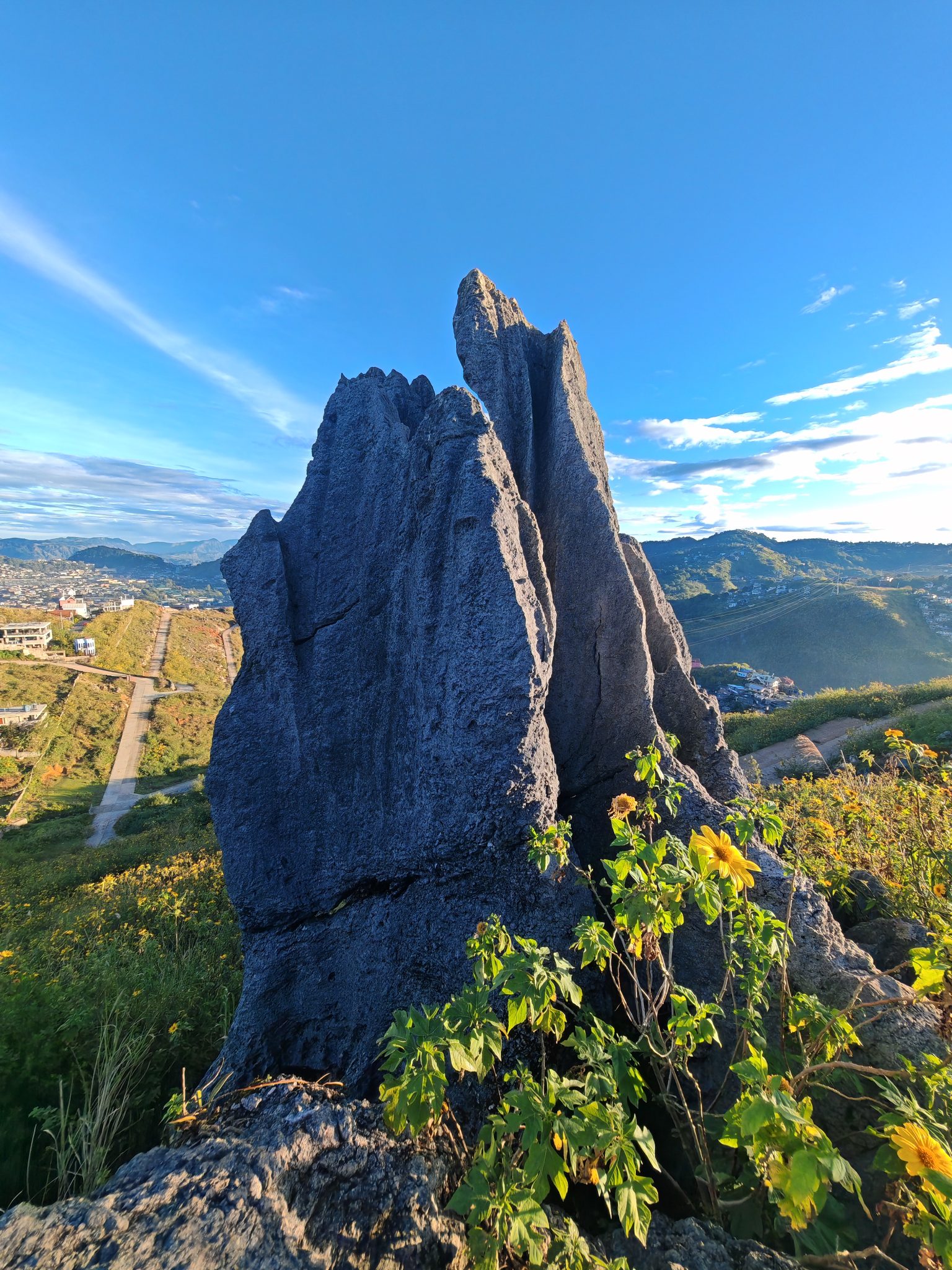 Alternative Text: A jagged rock formation stands prominently in the foreground, surrounded by green vegetation and yellow wildflowers. A scenic landscape with hills and a partly cloudy blue sky stretches out in the background.