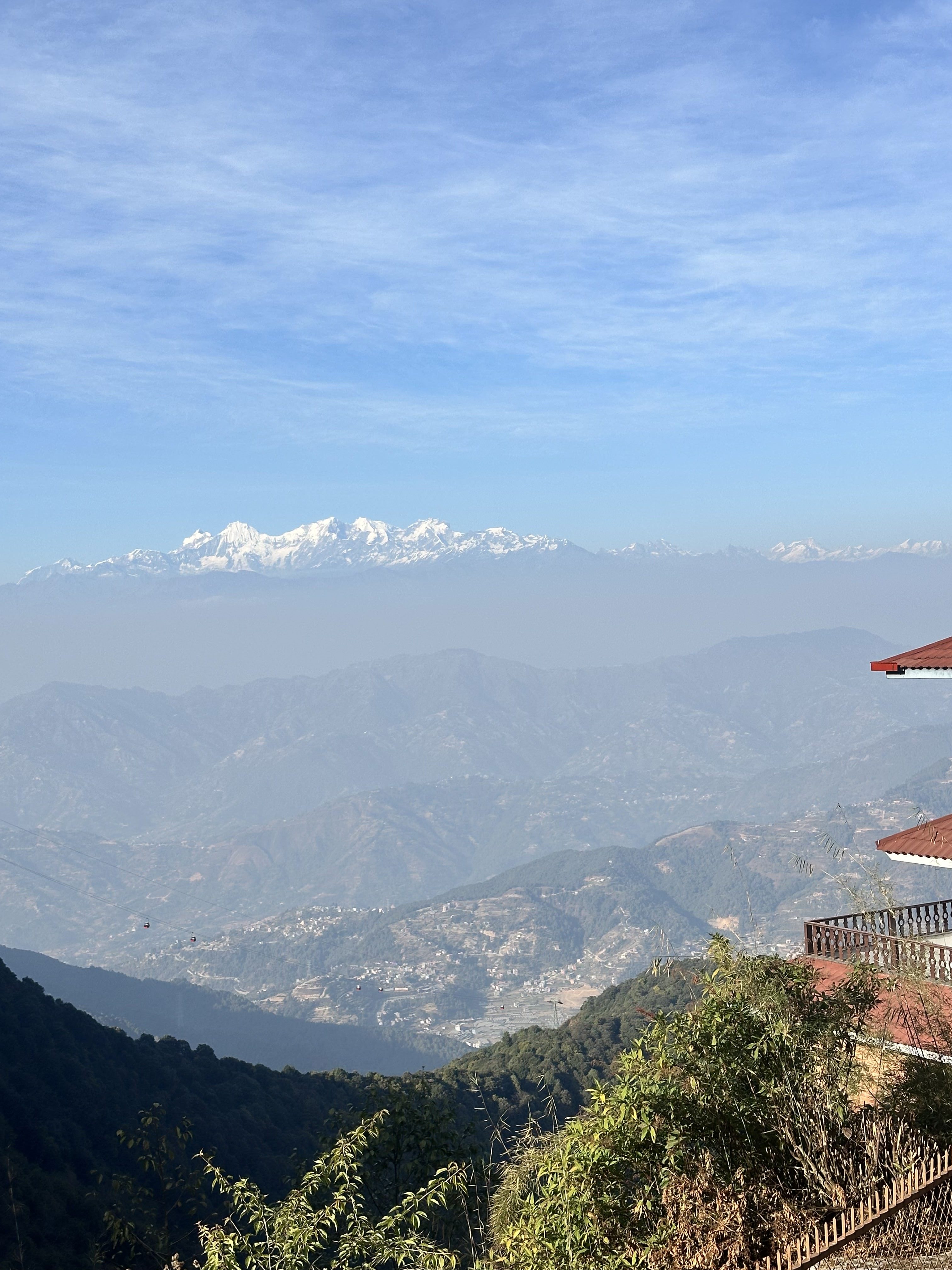 Alternative Text: A panoramic view of snow-capped mountains against a blue sky filled with wispy clouds. Below, rolling hills and valleys stretch out, displaying a mixture of greenery and cultivated land.