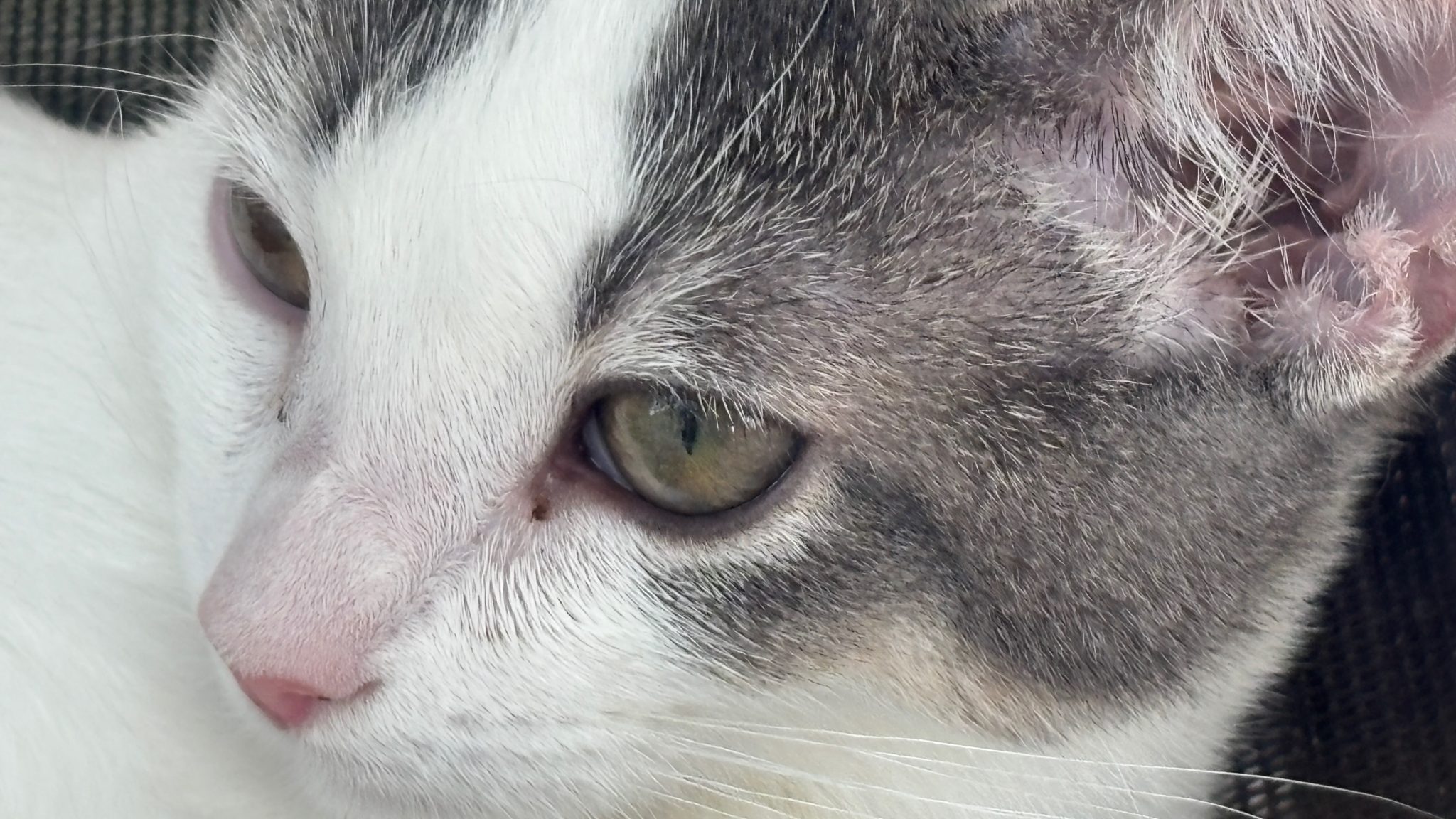 Alternative Text: The face of a cat, close up, looking away from the camera.