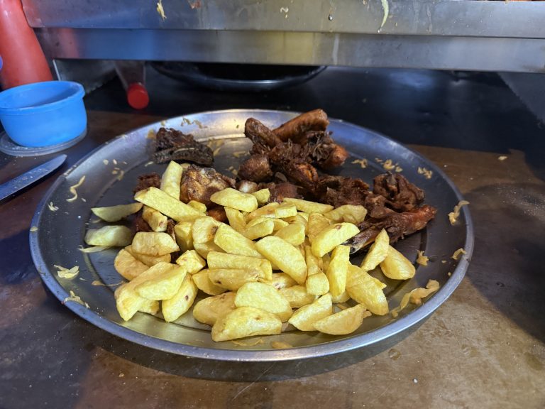 Alternative Text: Street fried chips and chicken on a platter, a few cabbages and ketchup
