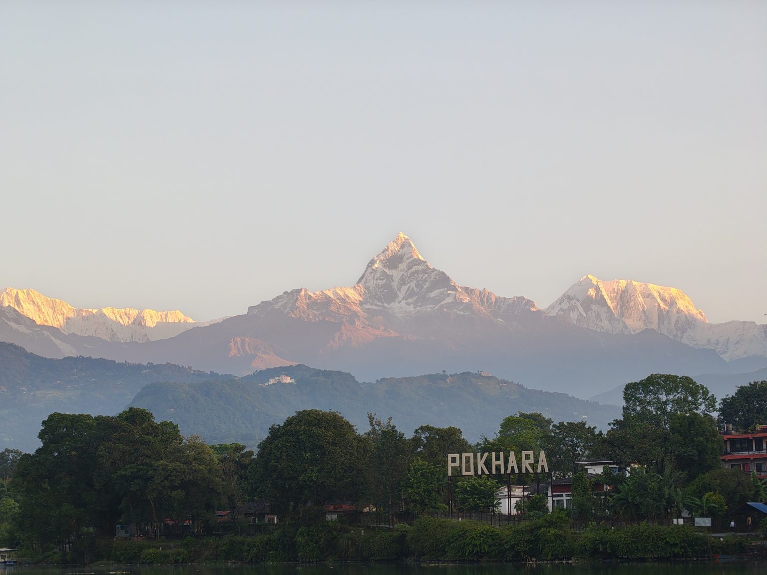 Alternative Text: A scenic view of snow-capped fishtail (machapuchare) mountains bathed in early morning light, with soft pink and golden hues on the peaks.
