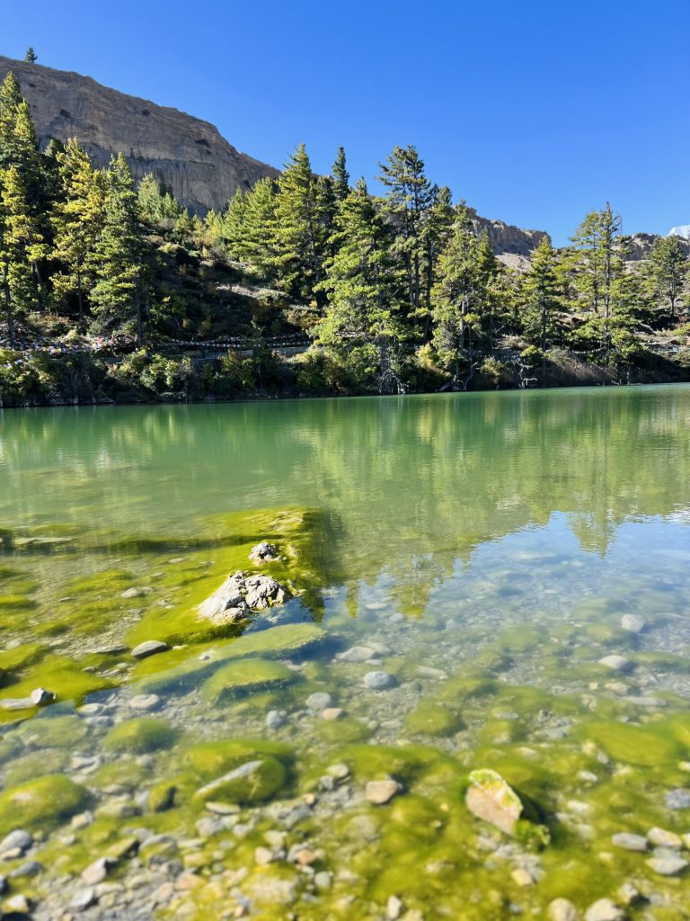 Alternative Text: A serene Dhumba lake reflecting blue skies and surrounding greenery.