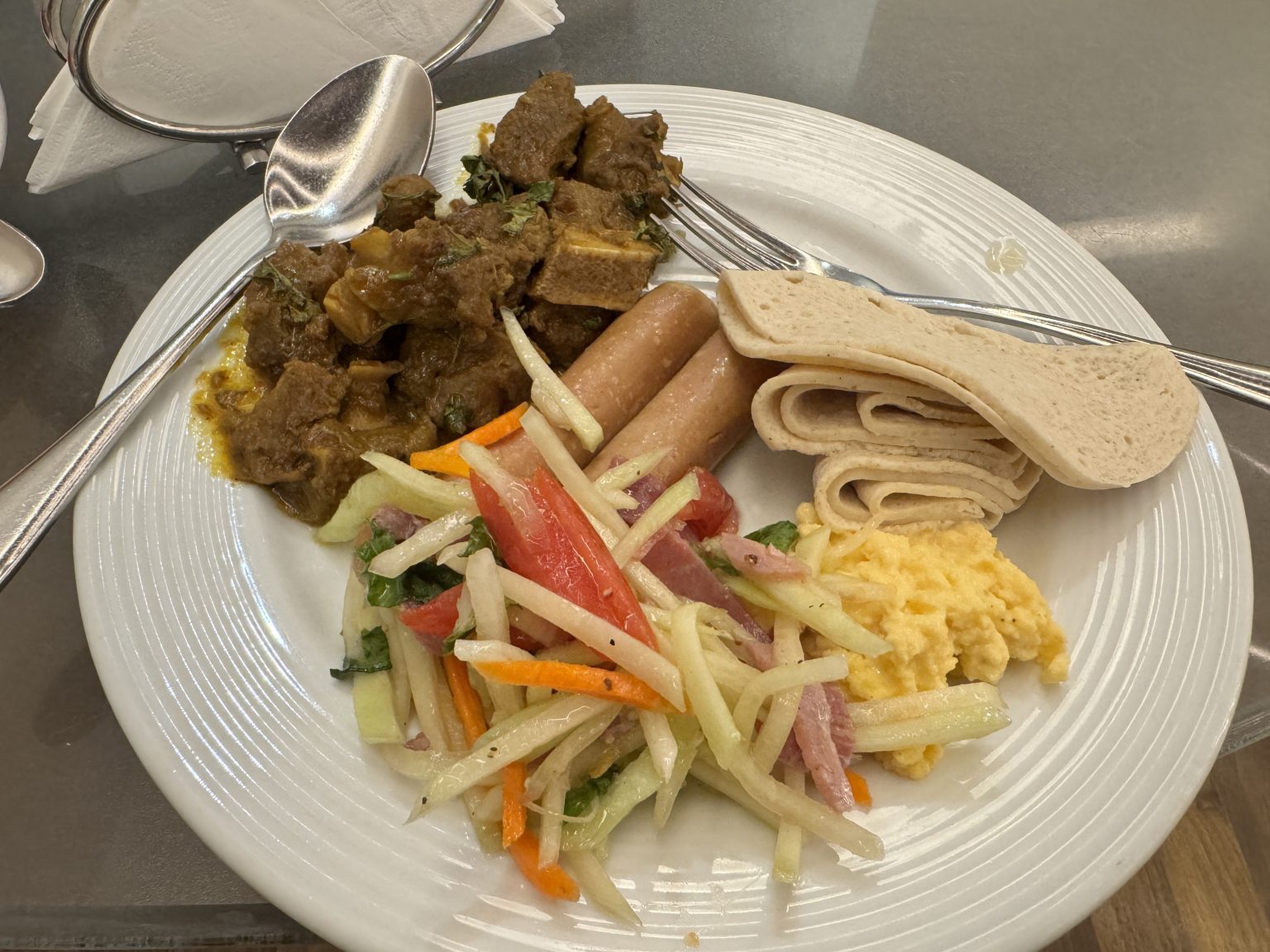 Alternative Text: A plate of food with curry, sausages, flatbread, salad, and scrambled eggs.
