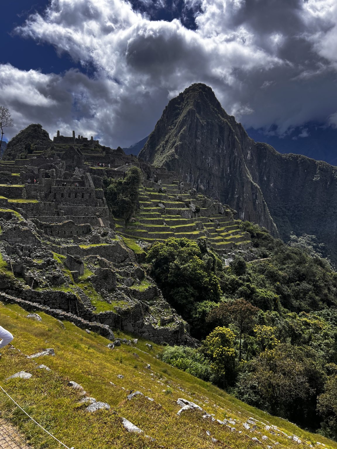 Alternative Text: A panoramic view of Machu Picchu, showcasing ancient stone ruins perched on a steep hillside. The structures are set against lush green terraces and are surrounded by towering mountains under a partly cloudy sky. The foreground features grassy areas and some rocky terrain, while a few visitors can be seen exploring the site. The dramatic landscape reflects the beauty and historical significance of this iconic archeological site.