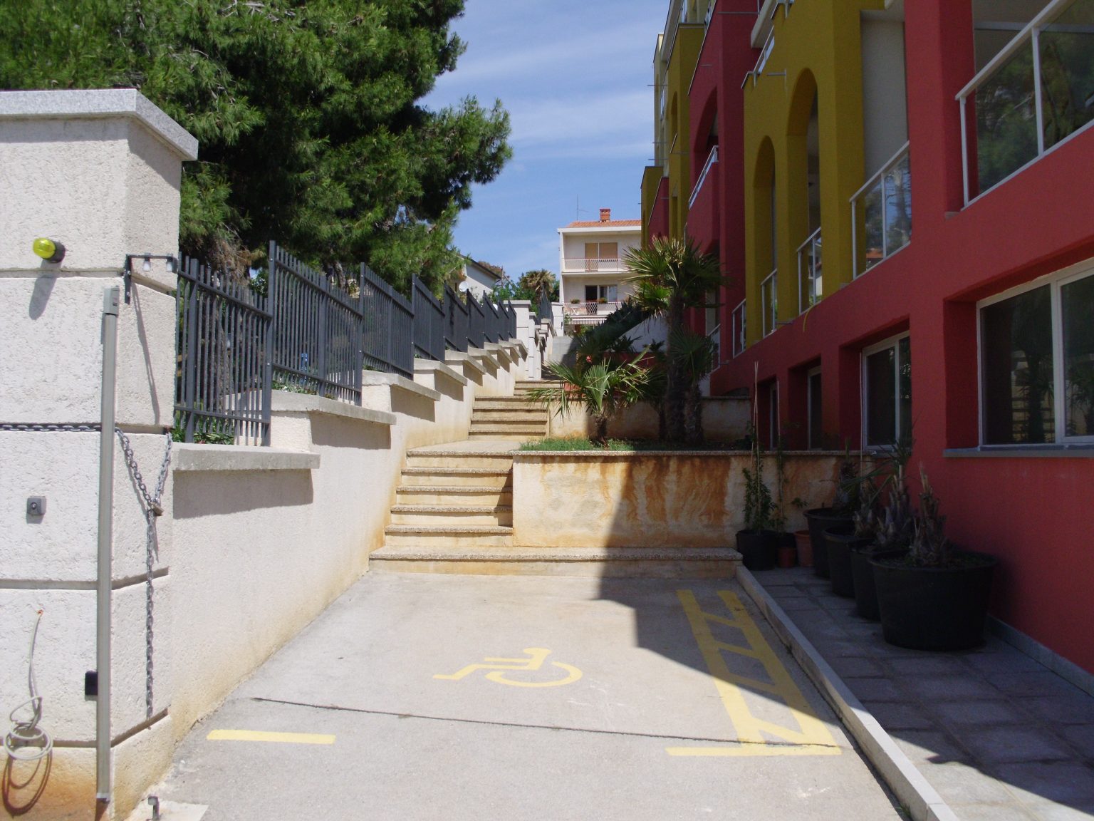 Alternative Text: Stone steps go up between the metal fence of the park and the hotel wall