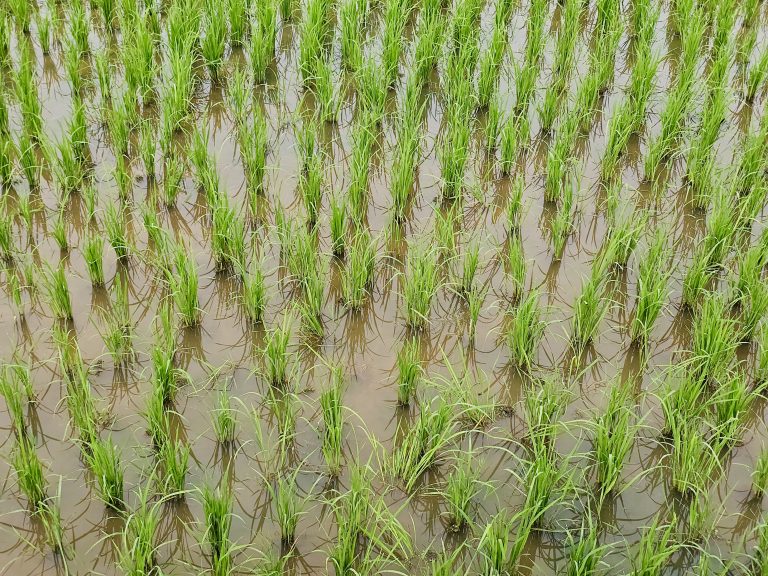 Alternative Text: Young green rice plants growing in neat rows in a flooded paddy field. Captured in Vazhakkad, Malappuram.