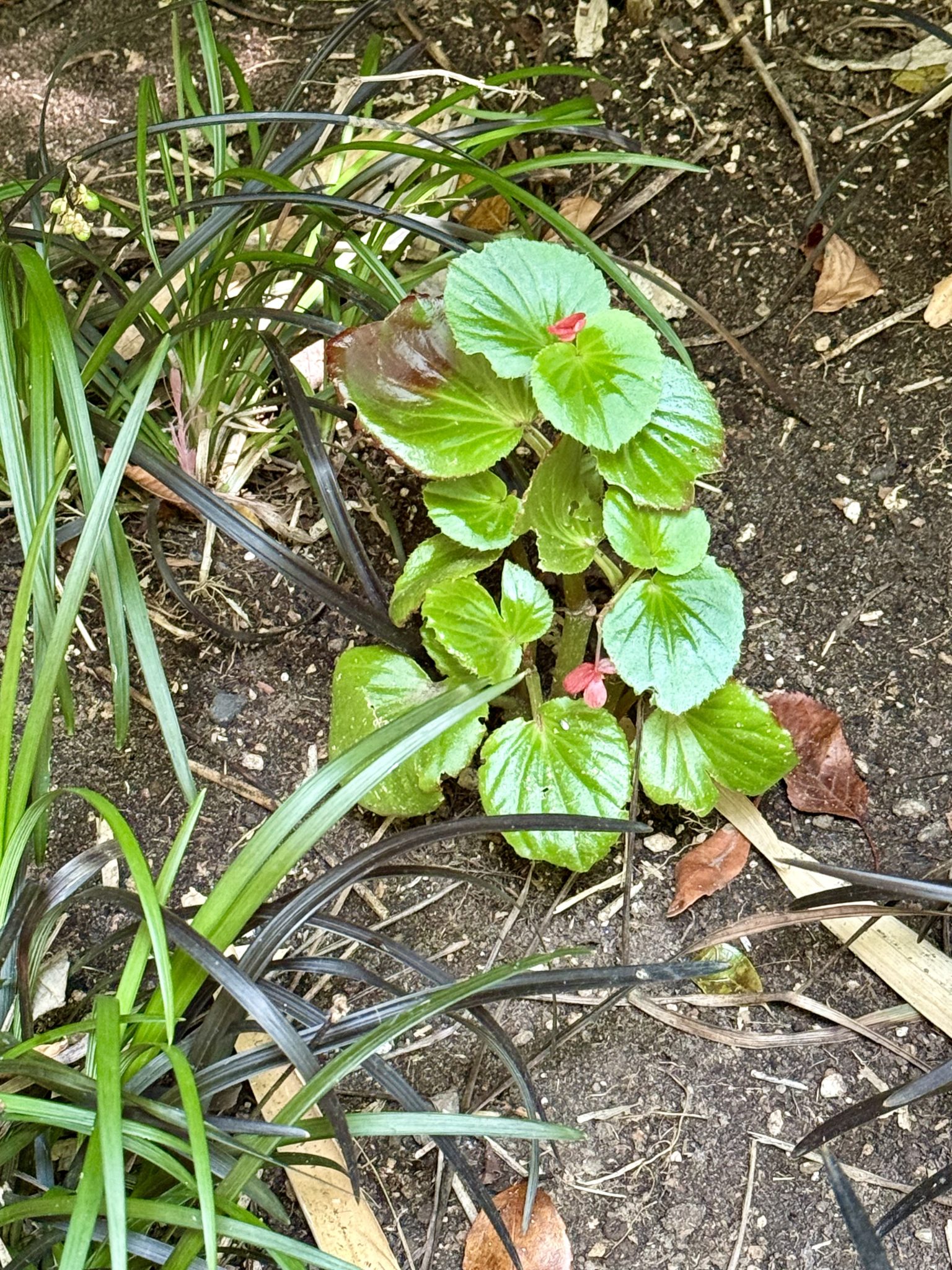 Alternative Text: A small green plant with glossy leaves and a single red flower bud. Taken from the Oregon Zoo, Portland.