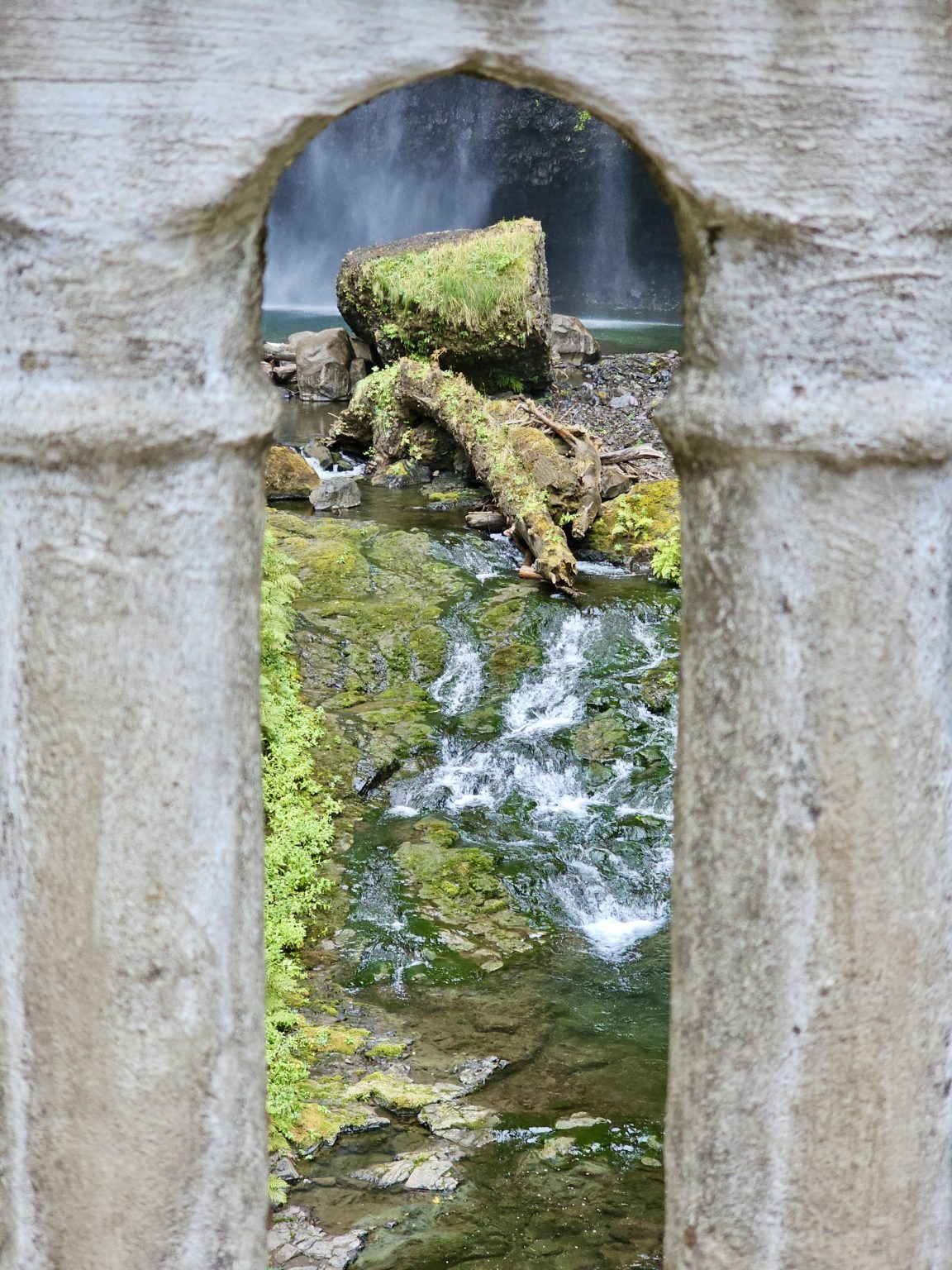Alternative Text: A view through a stone arch showing a small waterfall and mossy rocks in the creek below. Captured in the Columbia River Gorge National Scenic Area, Oregon.