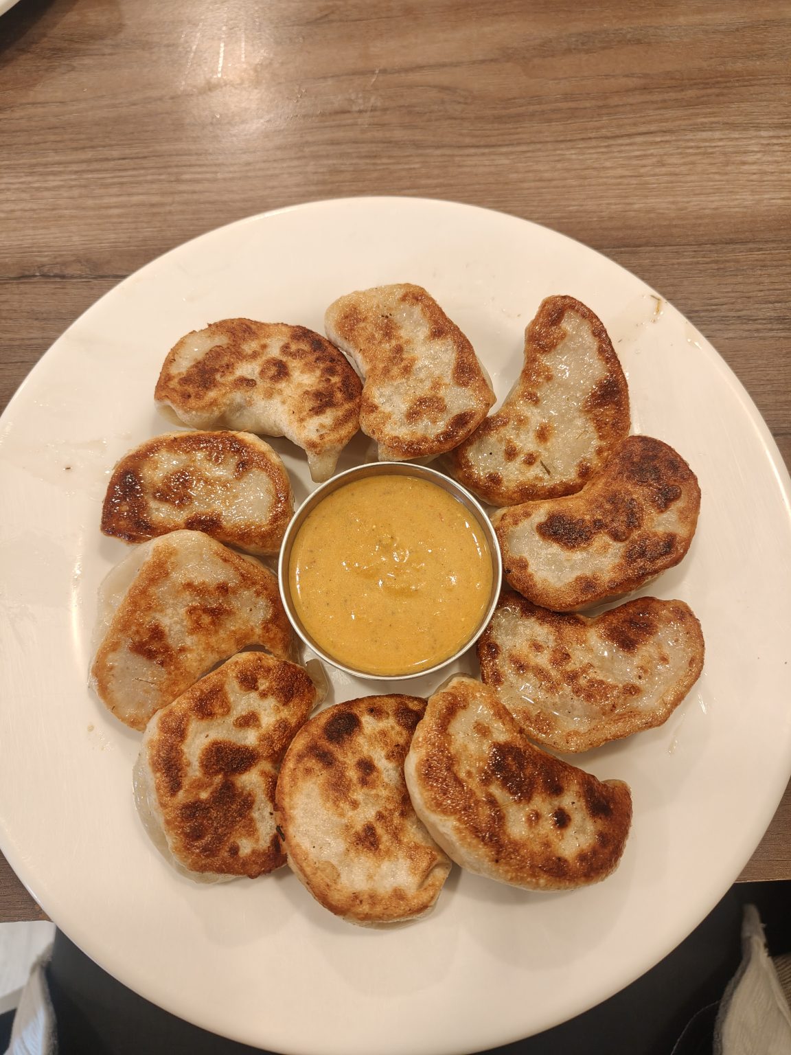 Alternative Text: A circular white plate features a ring of golden-brown pan-fried dumplings arranged around a small metal bowl filled with a creamy yellow sauce.