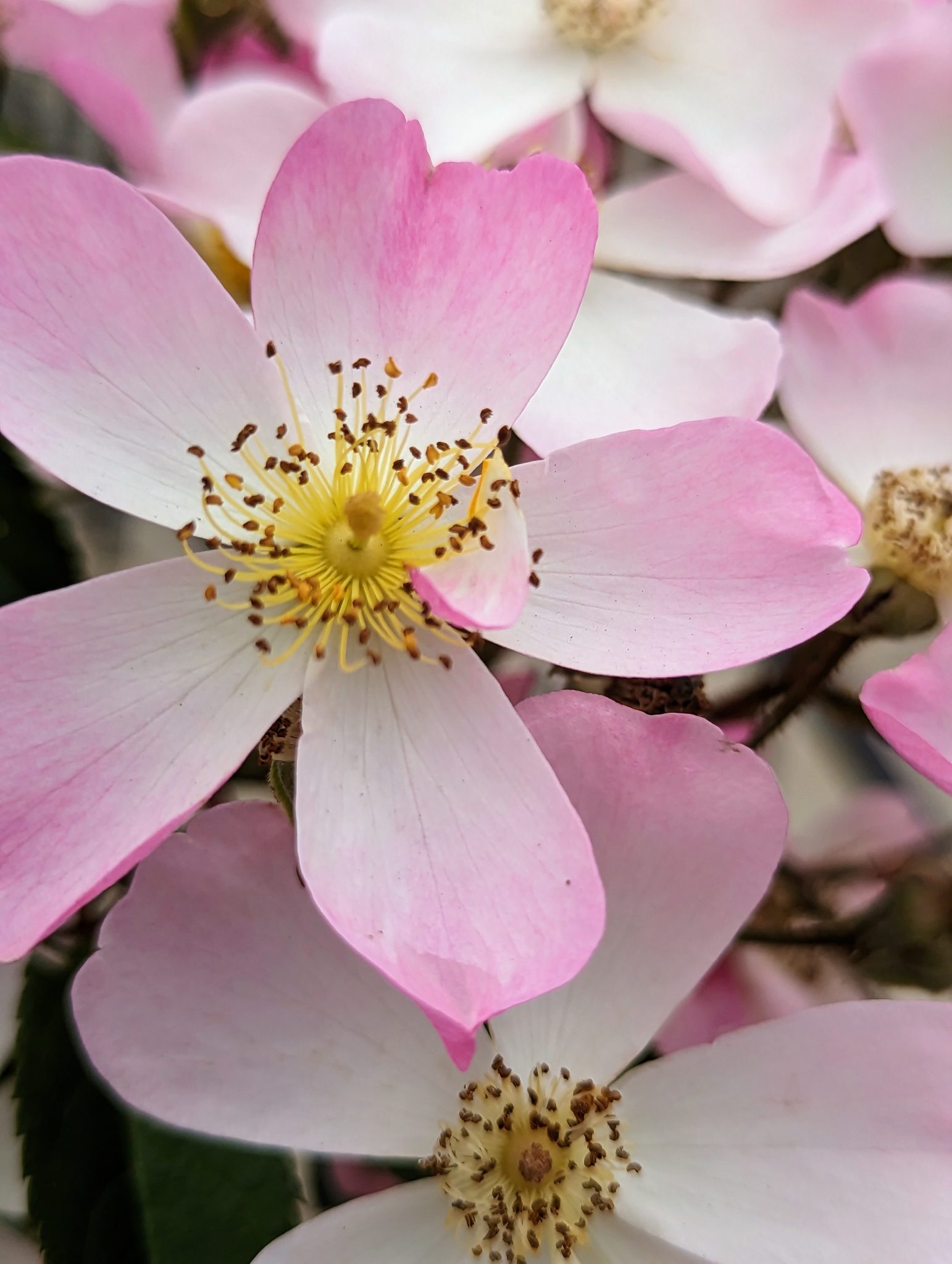 Alternative Text: Close up of a white, pink and yellow flower.