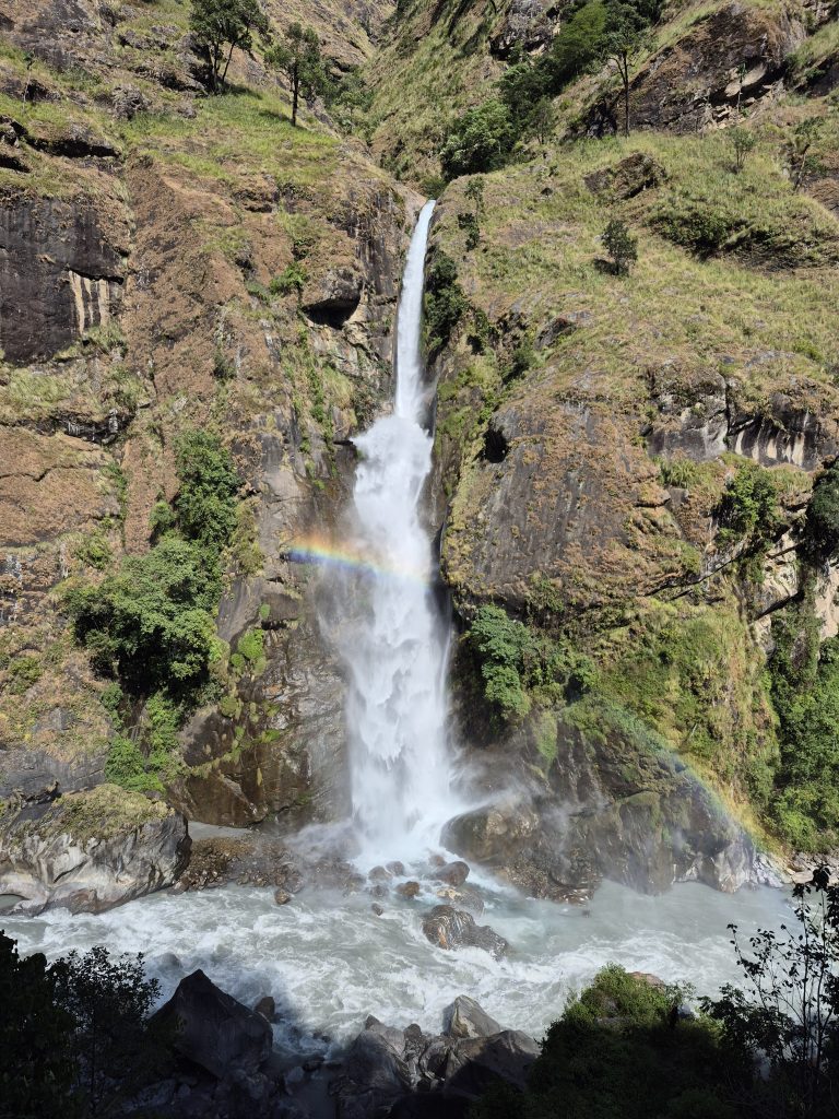 Alternative Text: A waterfall cascades down a rocky cliff surrounded by lush greenery, with sunlight forming a rainbow in the mist and white water flowing into a river below.