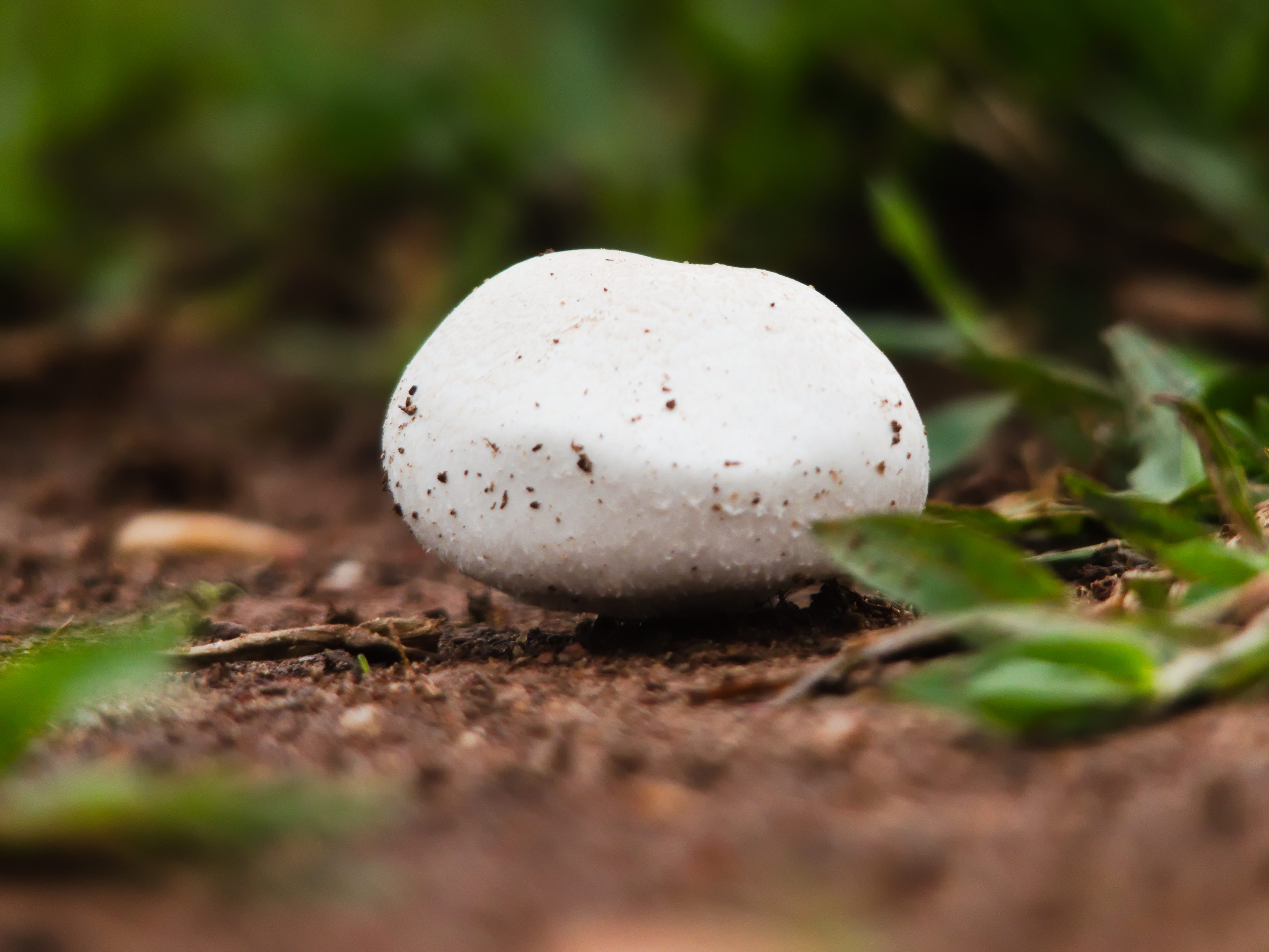 Alternative Text: A close-up image of a small white mushroom growing in the soil, surrounded by green grass and leaves.