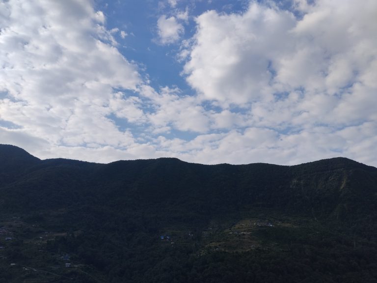 Alternative Text: A scenic view of a mountain range under a sky filled with scattered white clouds. The mountains are covered in lush greenery, and there are small buildings visible at the foot of the hills.